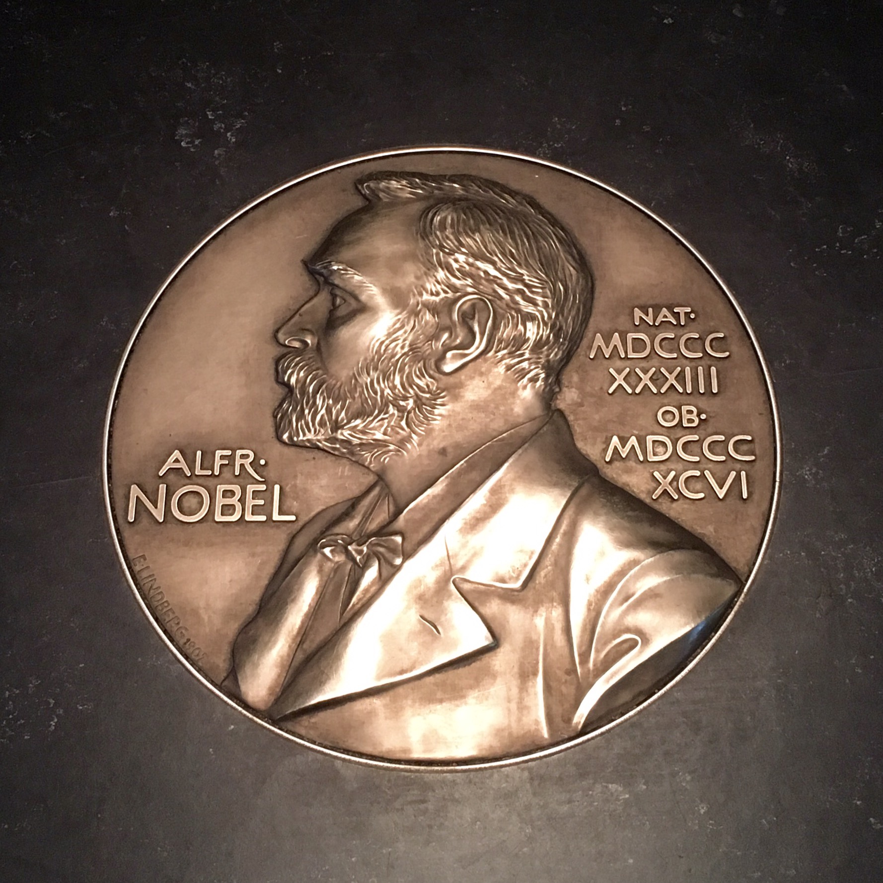 We took the tour of the Nobel Museum in order to compare it to the Nobel Peace Prize Museum in Oslo, Norway, that we visited when we were there a couple years ago. There are two museums because Alfred Nobel’s will (which created the trust for the prizes) directed that the Nobel Peace Prize was to be awarded by and in Norway, whereas all the other Nobel Prizes were to be awarded by and in Sweden. Nobody in either museum can explain why Nobel set things up this way, but it allows each country to lay claim to Nobel’s noblesse oblige. There’s a relief of the old dynamite inventor on the floor of the museum here in Stockholm: