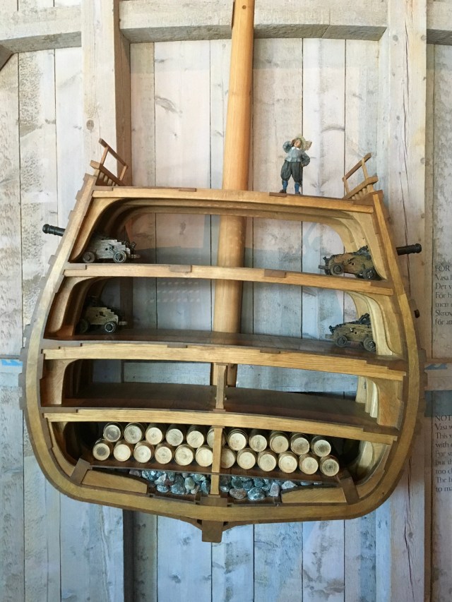 It’s hard to get a sense of the scale of this mighty ship from photographs, but consider these dimensions: length (from bowsprit to transom) 226 feet; beam (width) 38 feet; draft (depth at waterline) 16 feet; and, height to top of main mast, 172 feet – that’s nearly the size of a 17-story building! The ship is too big to take in all at once, but, fortunately, there’s a fantastic scale model (1:10) of the Vasa under sail right near the museum entrance. It took 12,000 hours to build the model, imagine how long it took to build the ship, itself.
