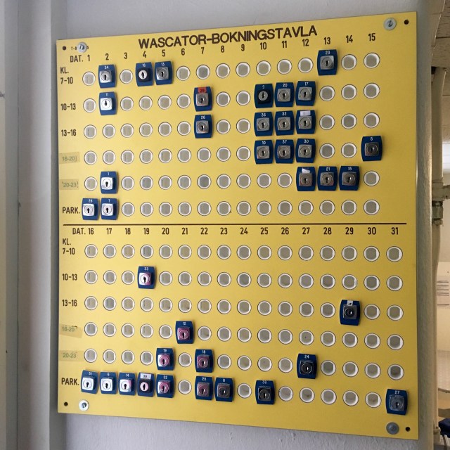 Wonder how I found the time to research and write about so much of Sweden’s history recently? Answer: Laundry Day. The forecast was cold and drizzly and we had been here for 10 days, so we decided to stay in for the day to take care of domestic chores. You might think that doing laundry would be boring. Not so. Here it requires serious planning and concentration.