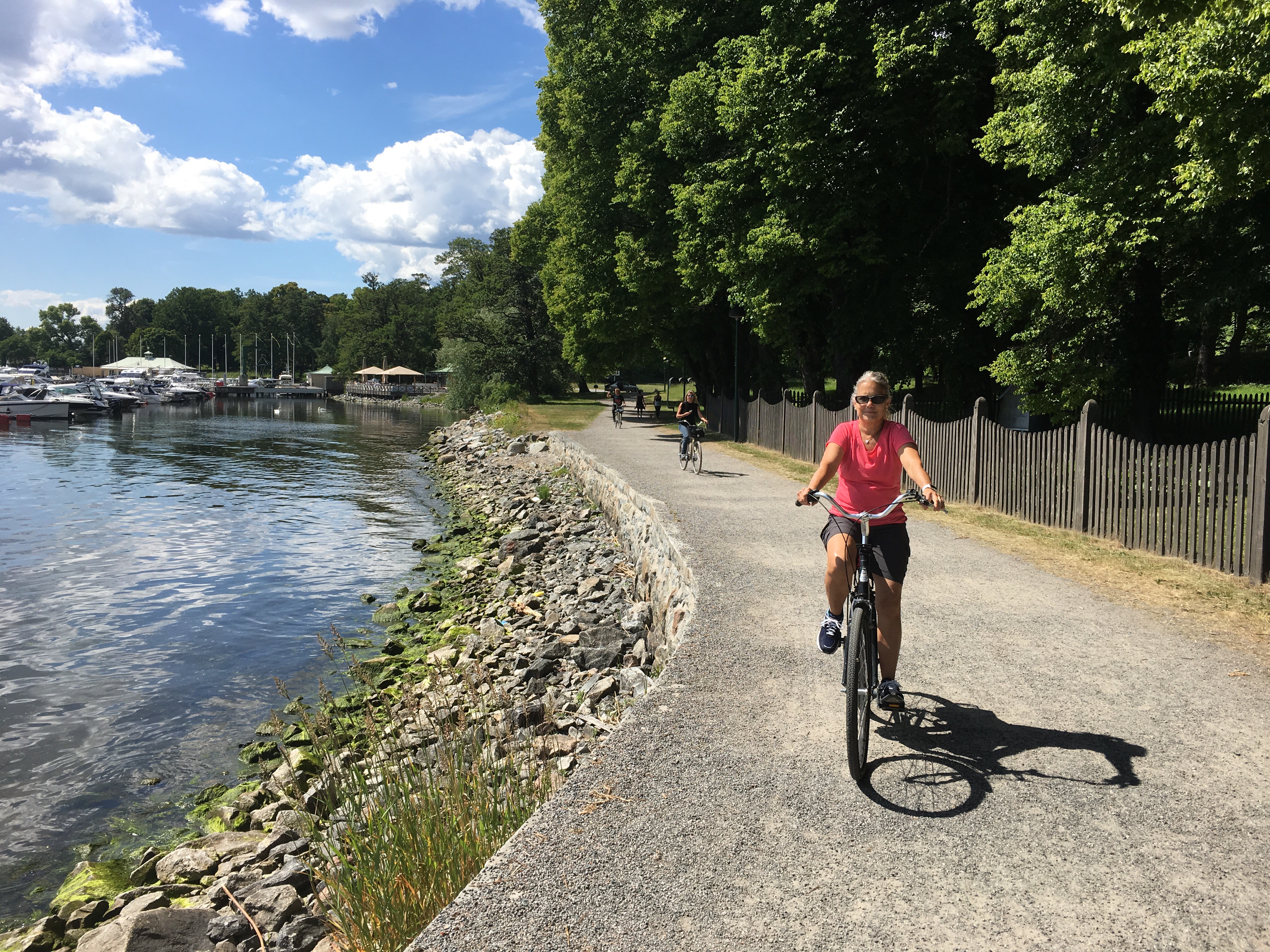 It was a beautiful day and a fun ride. The terrain is mostly flat and the whole course took us almost exactly 4 hours, but we had sore butts by the time we finished, so it’s a good thing we’ve brought biking shorts along for the Baltic ride. Riding through Södra (southern) Djurgården was espcially delighful. After stopping at the Rosendals trädgård cafe for lunch, we pedaled along the waterfront for a couple miles.