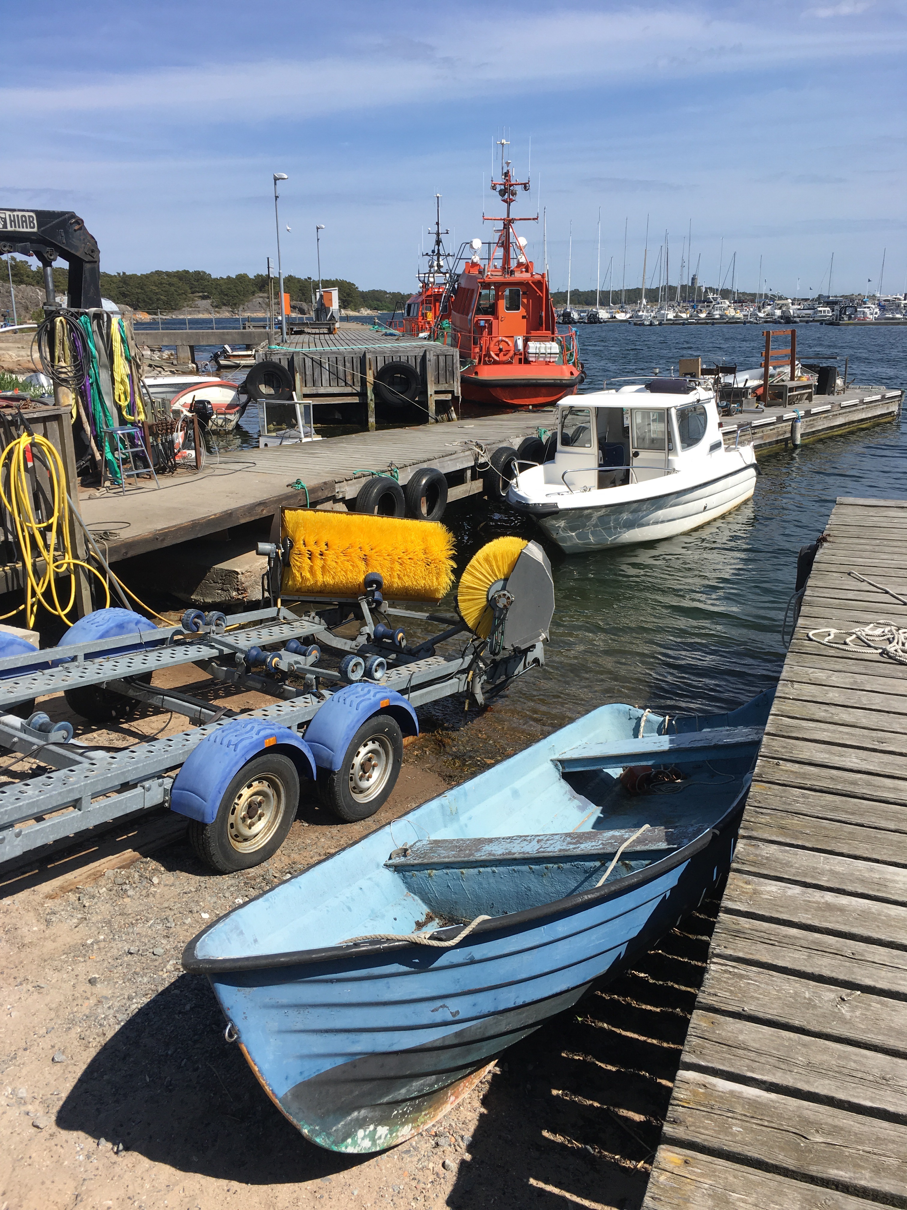 It’s a mobile bottom scrubber. Swedish has implemented new regulations limiting the use of various poisonous bottom coatings for boats that prevented growth of barnacles. The one in the picture offers this brushing service to speed boat owners. I have a slow boat and the barnacles don’t affect the speed much. Speed has a lot of costs to it!