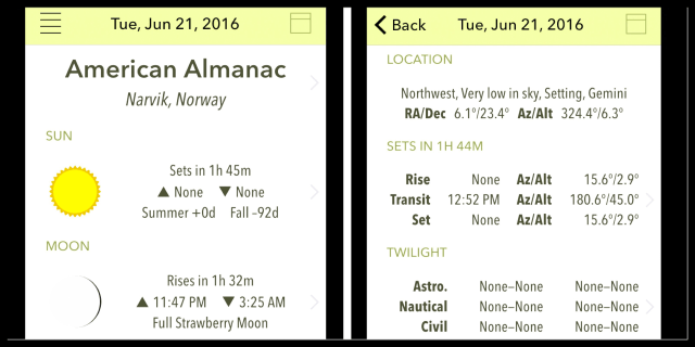 Here’s the astronomical data for Narvik, Norway, the nearest astronomical calculation I could find; Narvik is about 35 miles west of us: