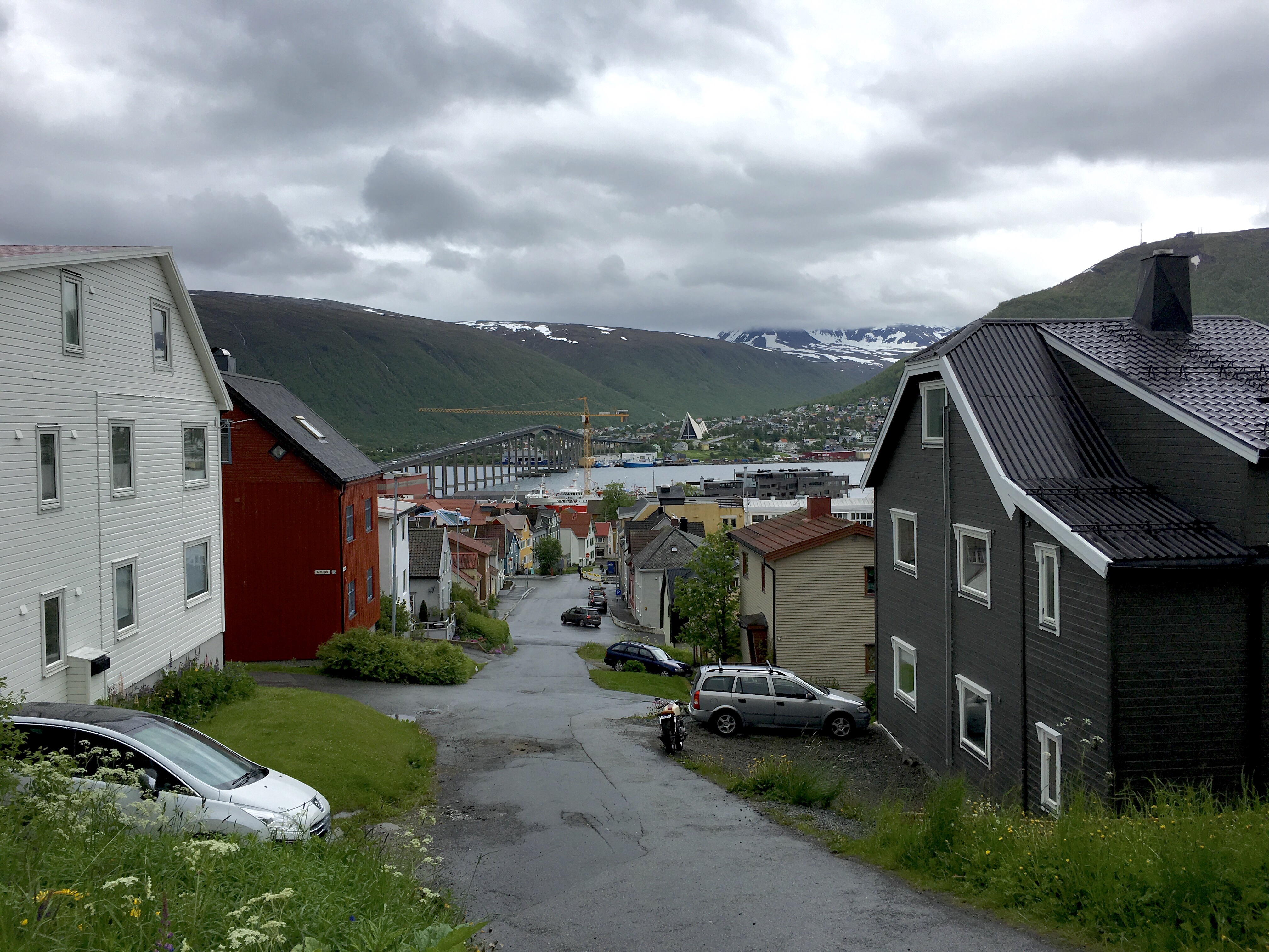 Most of the city is on an island. So, after crossing the bridge, we drove up the hill so I could take this photo, looking back east at the bridge and the big church on the other side of the sound. The buildings you see are pretty typical of the residential structures in Tromsø; they appear to be mostly multi-family, which seems to be the norm in urban Scandinavia.