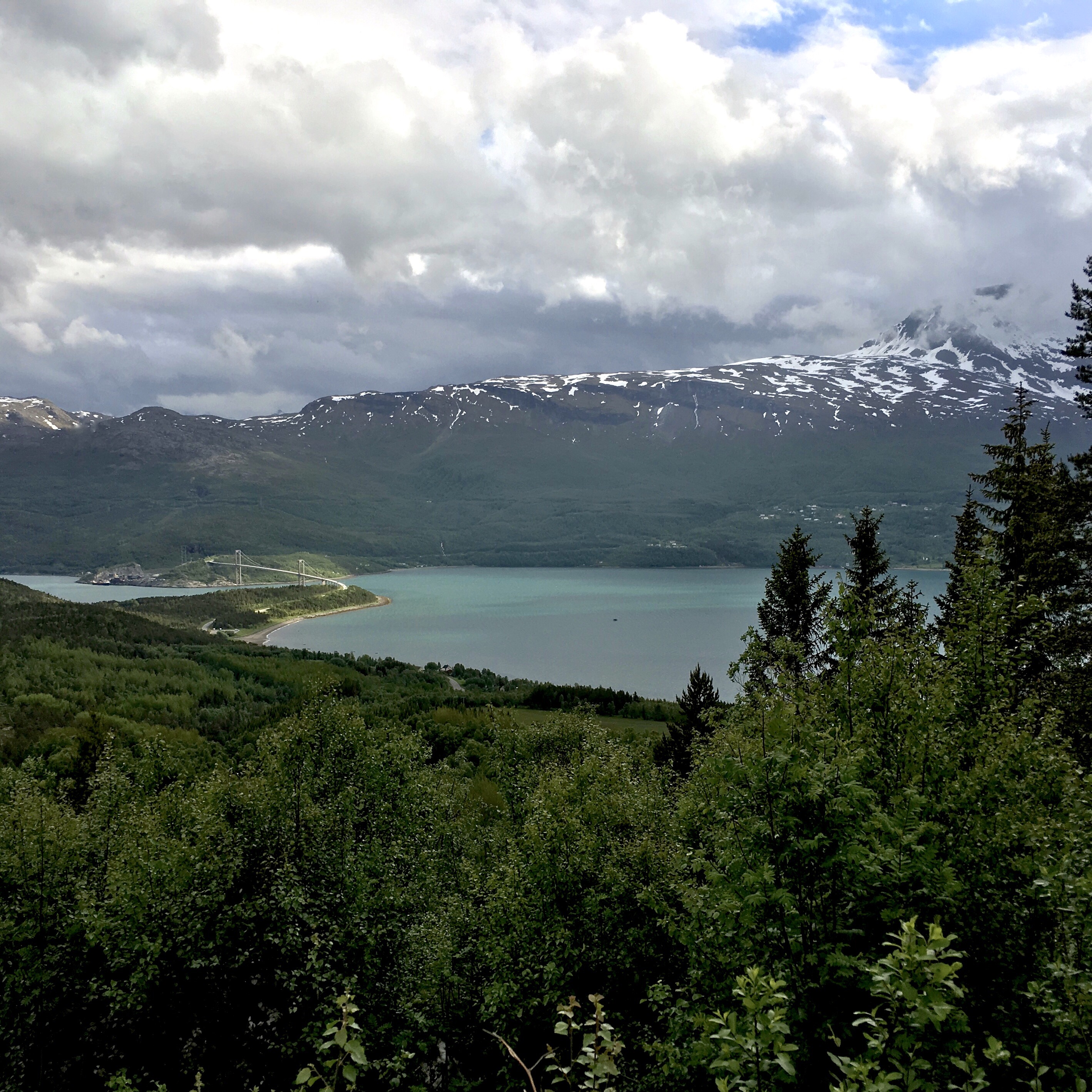 It amazes me that my iPhone can take photos like these. As I mentioned in my prior post, the roads here do not have shoulders, pull-offs or scenic overlooks, so the only photos I was able to take were when we were off the main road where there was no traffic and I could just stop in the middle of the street and snap away. Anyway, only a third of the drive was through the fjords; the rest was inland and, while beautiful, one picture of mountains and trees is much like another, so I’ll just give you one: this picture of the bridge to Narvik, taken from one of the few pull-off areas on E10, mainly for the truckers, not the tourists: