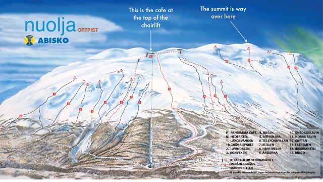Rested and ready after our driving day, we woke early intending to hike as much of Abisko nationalpark as we could in one day. The highest point in the park is the summit of Mt. Njullá at 1,164m (3,820 ft.). In the winter, Njullá is a ski mountain and there’s a single chairlift at 400m (1,315 ft.) that you can ride up to 900m (2,950 ft.). The skiing is in the middle of the mountain, above the treeline at 650m (2,130 ft.). Woah, that’s too many numbers; here’s a picture, it makes it easier to grasp: