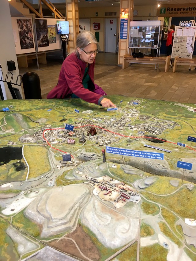 The Kiruna mine is the largest underground iron ore mine in the world, producing over 26 million tons of iron ore annually. You can see the empty railcars lined up on the tracks to the right in the photo, below, bound ultimately for the port at Narvik and the wider world beyond. To the left is what is left of the mountain (Kiirunavaara) that LKAB has been strip-mining for decades.