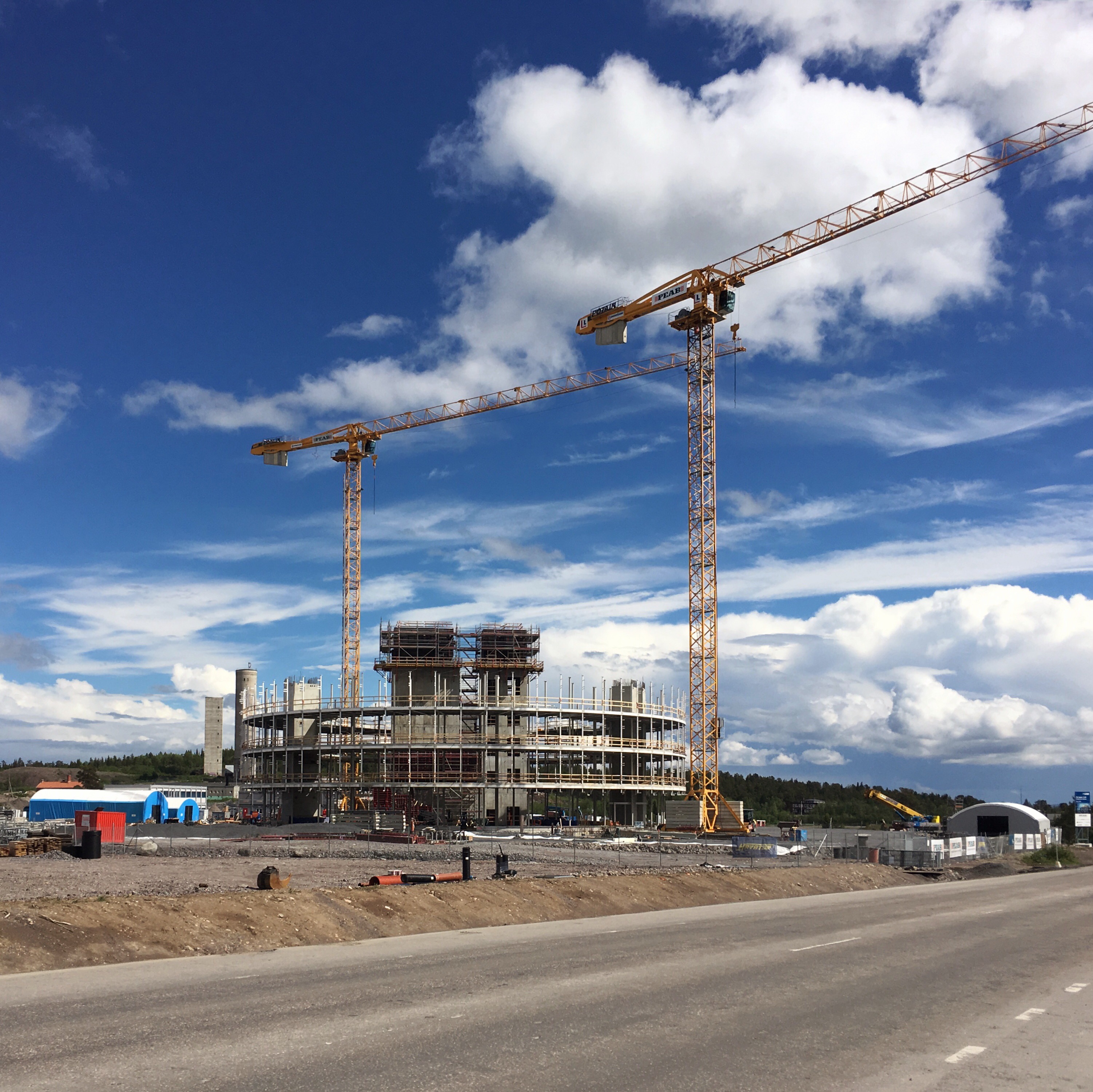 I say “old city hall” because LKAB is building the city of Kiruna a new city hall since the old one – like most of the city center – is now unstable as the ground subsides due to the mineshafts below. The subsidence first became obvious in 2003 and relocation and reconstruction began in 2014. Here’s the new city hall, under construction about 1.8 miles to the east: