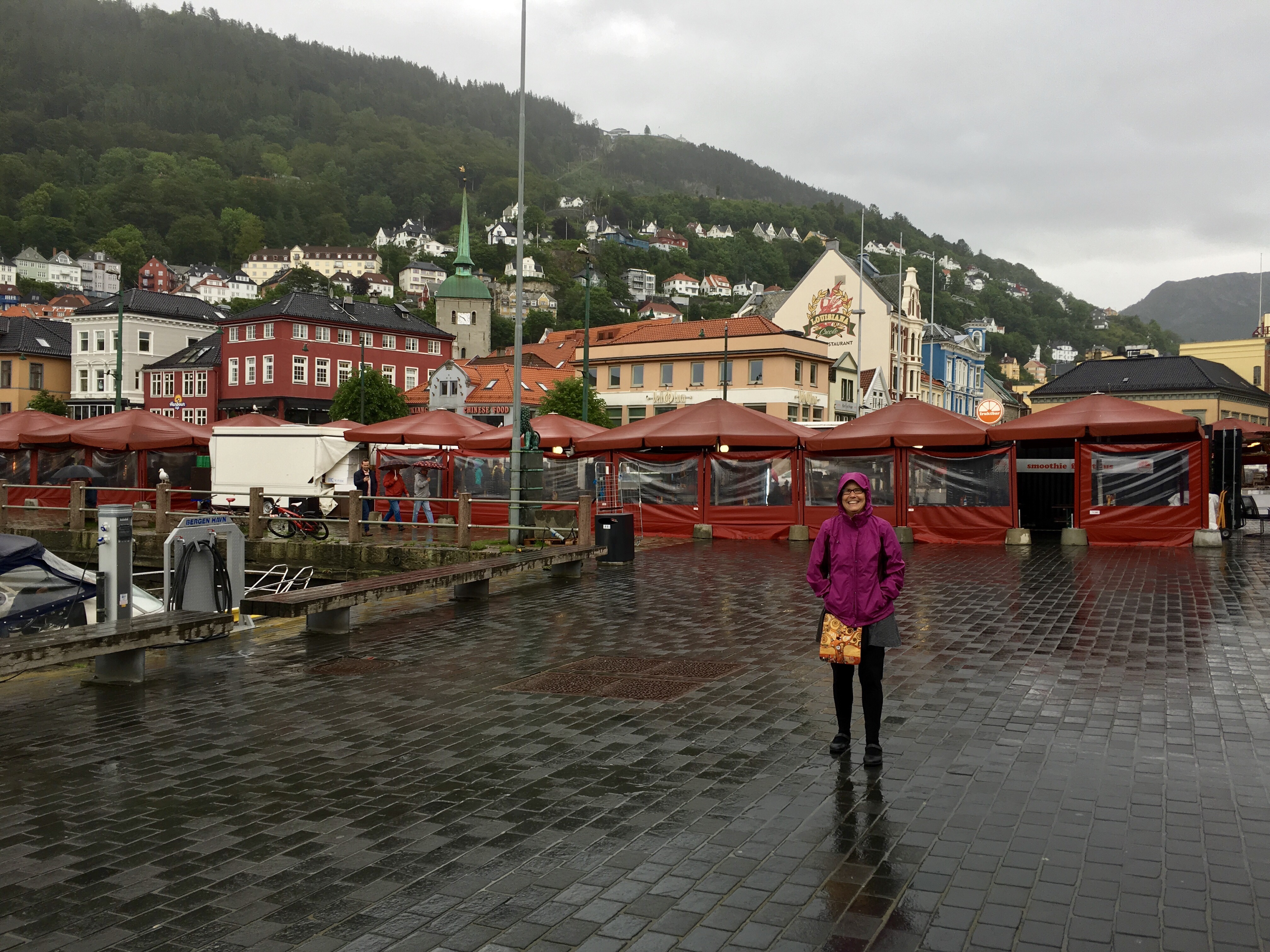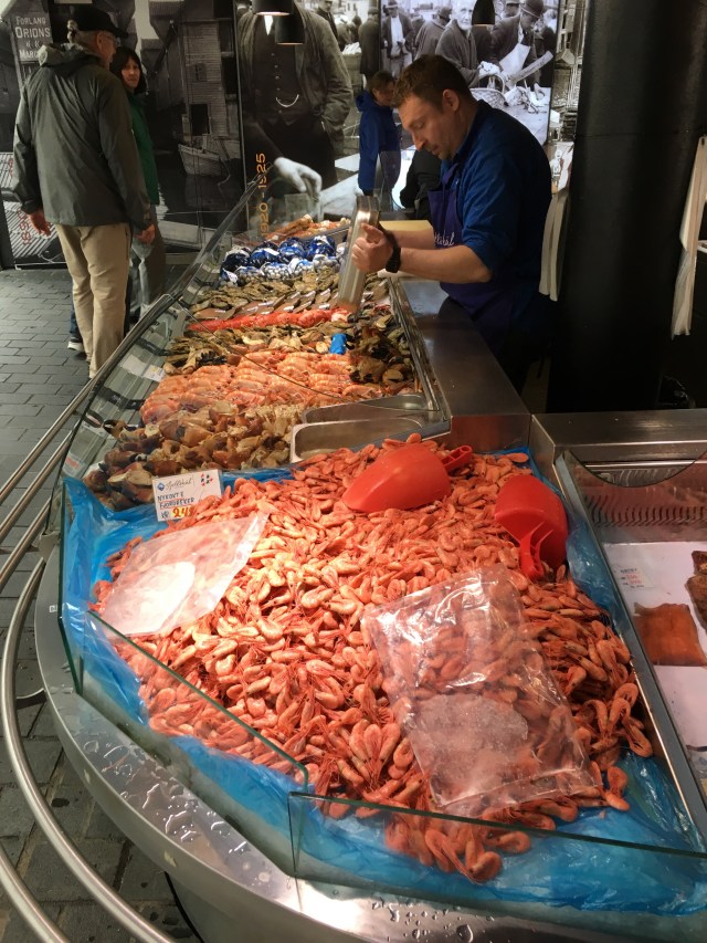 We arrived in Bergen in the mid-afternoon in the rain. No surprise there. Although Bergen is the warmest of the Nordic cities due to the Gulfstream, it also one of the wettest, a result of the encircling mountains. The bus from the airport dropped us off right at the end of the harbor across from the fishmarket.