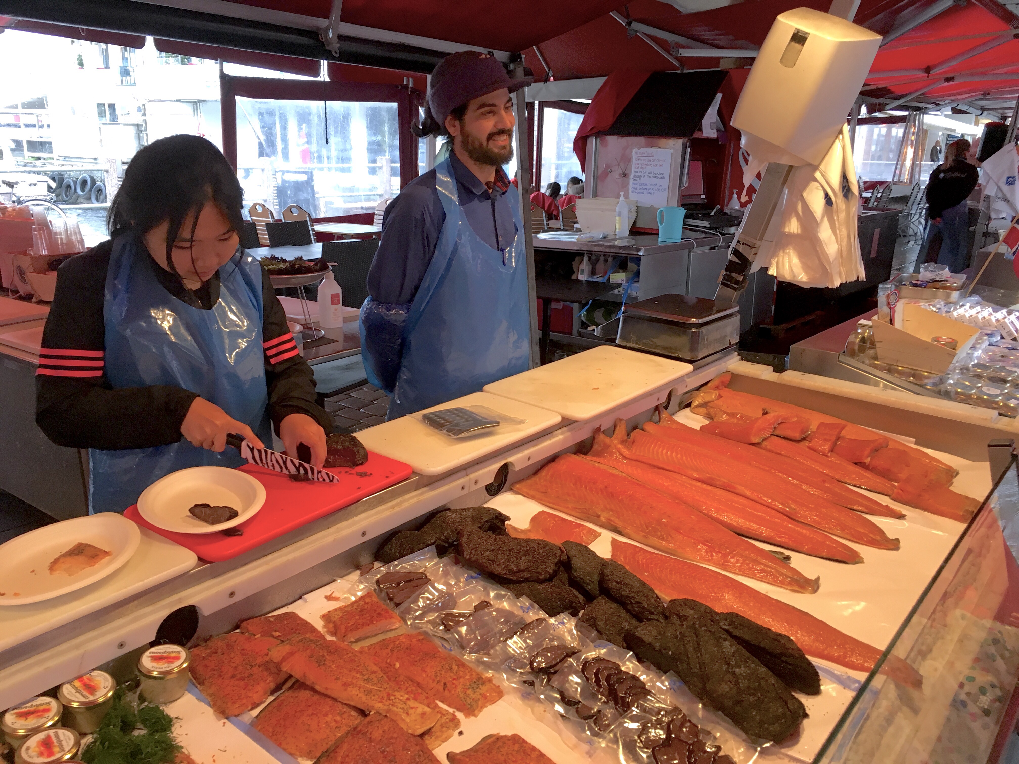 First, we visited all the vendors, sampling their wares. This one gave us a taste of whale meat. Tastes like chicken. Well, not really. Tastes like rancid beef jerky.