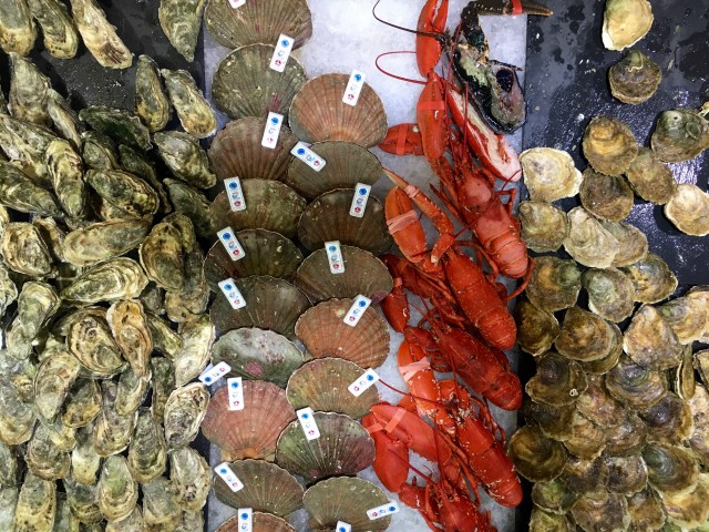 And the oysters and scallops (the oysters on the left are from France; those on the right are from Norway; scallops in the middle):