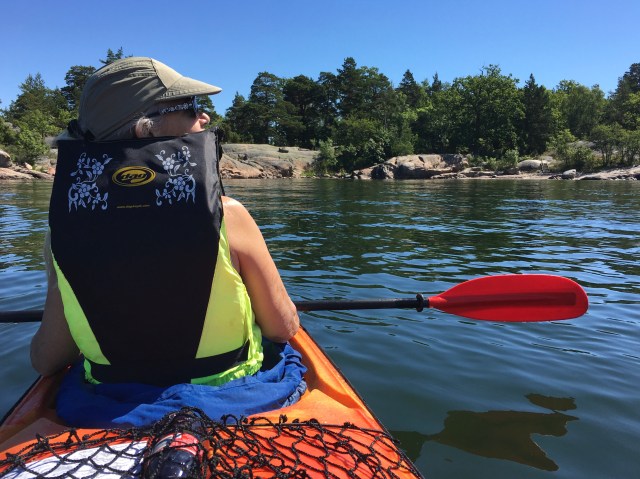 I tasted and felt the water: it’s brackish and not too cold, maybe 60°-65°F, about 10°F warmer than the water around the San Juan Islands of Washington State. I suppose the water here has low salinity because of the snow melt that finds its way into the Baltic Sea at this distance from the much saltier Atlantic Ocean. At any rate, it was a fairly easy paddle, taking a little over two hours to circumnavigate Grinda.