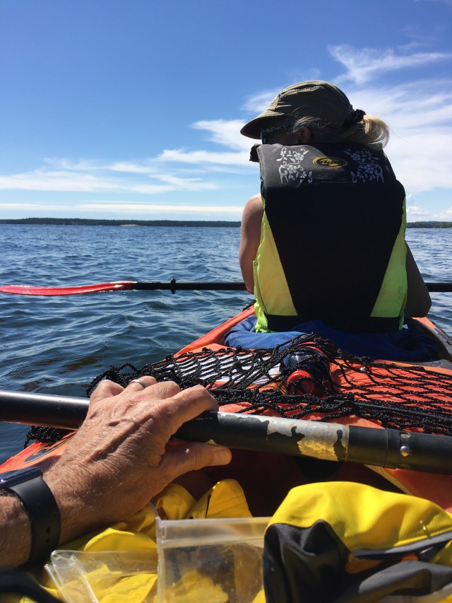 For her birthday, Dale wanted to kayak all the way around Grinda, about 6 miles. We had rented a two-person kayak the evening before, so we set off in the morning out of the harbor by the marina in a clock-wise direction around the island.