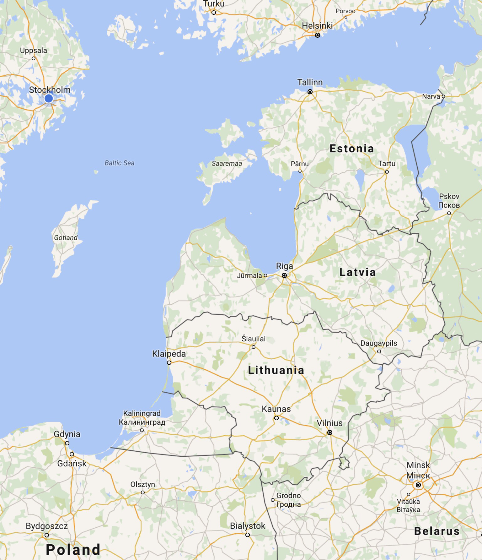 Tallinn, the capital of Estonia, is 235 miles nearly due east of Stockholm. We will be biking through all three of the Baltic countries, Estonia, Latvia and Lithuania, over the next two weeks, then we’ll be going to Russia for another week (Moscow, and St. Petersburg), followed by a couple days in Helsinki, Finland (on the map, below, just north of Tallinn), then overnight in Stockholm before returning home.