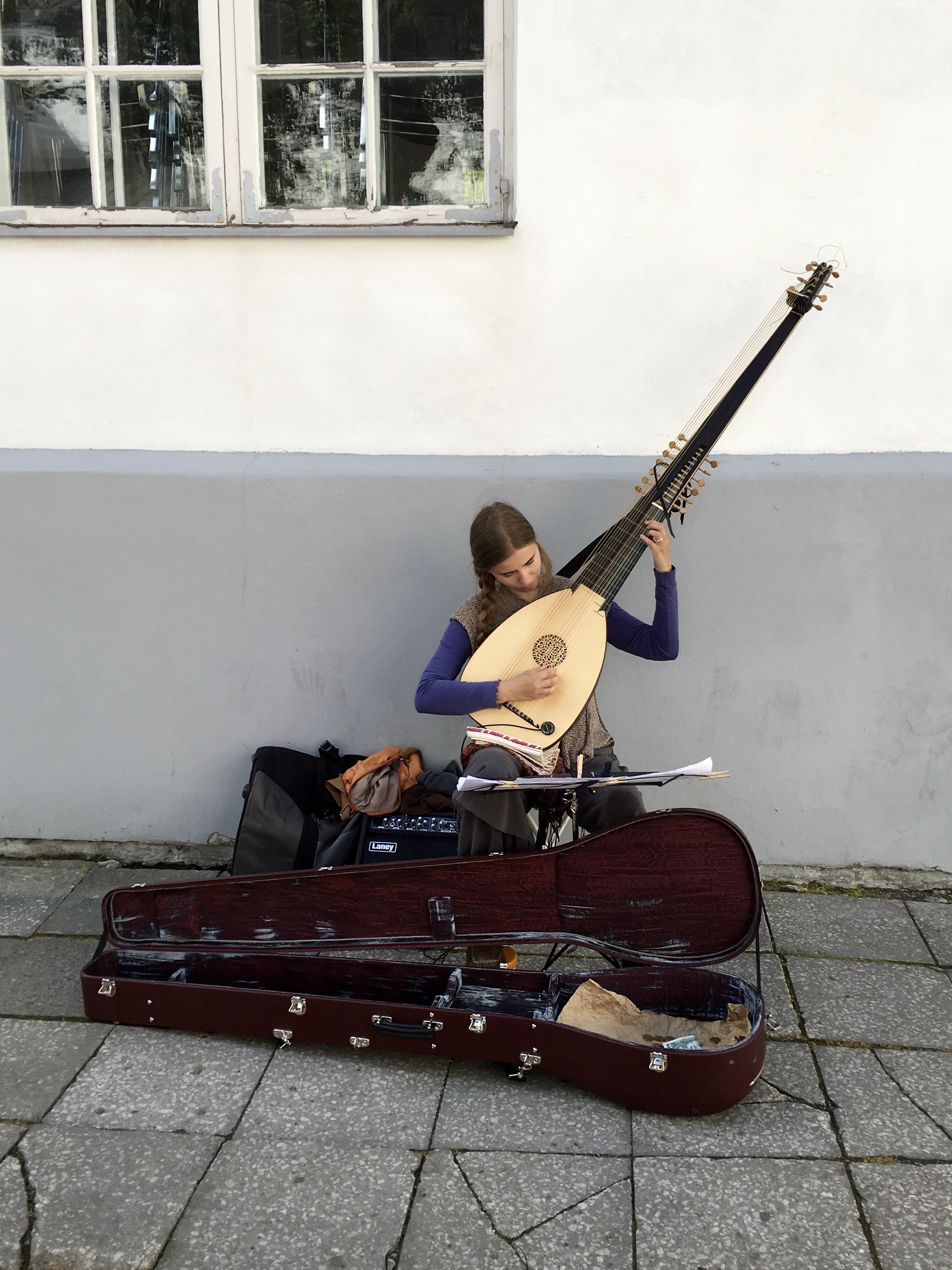 Back on top of Toompea Hill, we rounded the corner on our way to Tallinn’s oldest church, the Cathedral of St. Mary, in Estonian, the “Toomkirik,” and simply refered to as the Dome Church. On the way, we came upon this girl playing the archlute, an instrument from the 1600s. If I counted correctly, this instrument is, essentially, a 12-string “guitar” +1, with 8 bass strings. It was beautiful.