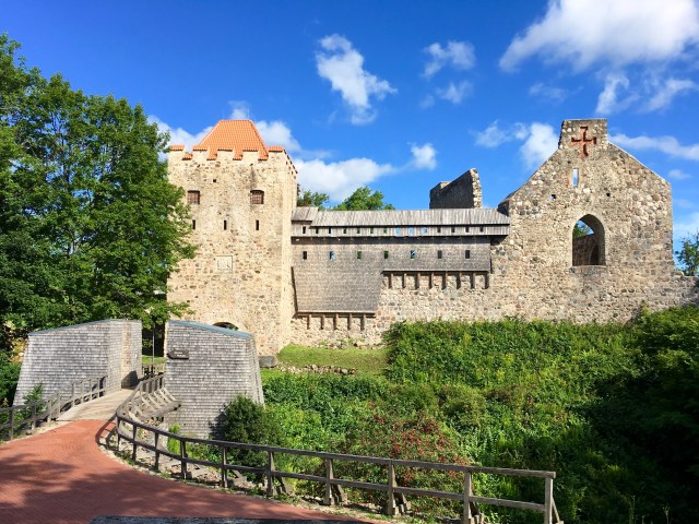 …in order to take in the view of the Gauja River below. That part of the castle with the clock on it – now mostly a reconstruction – was added in the 1400s for additional defense from cannon attack from the west, following the invention of gunpowder. The castle certainly dominated the valley.
