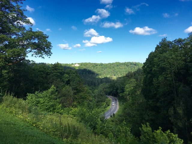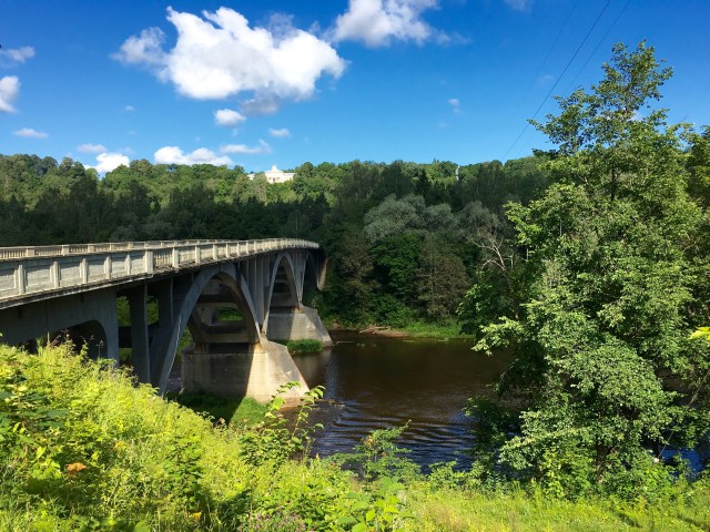 We didn’t spend much time here (and didn’t go inside either structure). We wanted to get across the river to see the grotto in the Gauja Valley. We were going to be riding down this road…