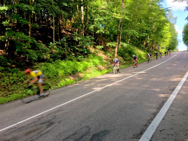 Gutman’s Cave is at the bottom of the Gauja River Valley at this location, so from here we started up the longest and steepest incline of the trip – just as a cycling race was making its way down! Look out below!
