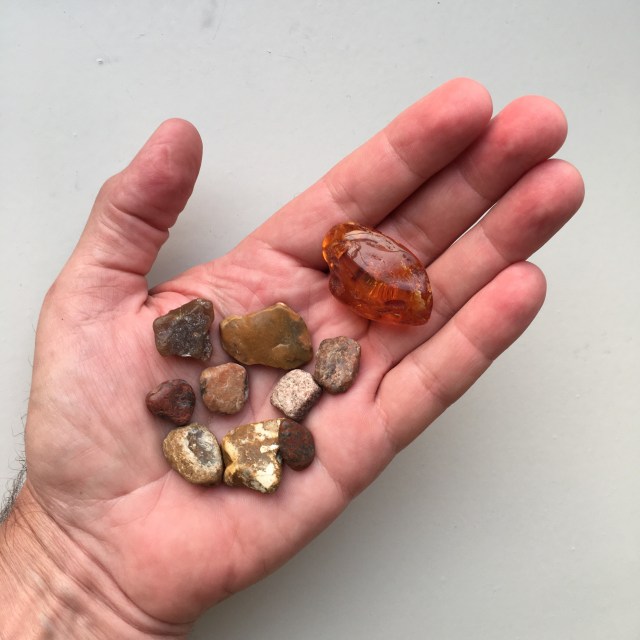 The big piece is the one I bought in Rīga; it has been polished. The rest we found on the beach just past Šventoji. They’re all very light and one test is to see if any of them float in saltwater. We’ll see.