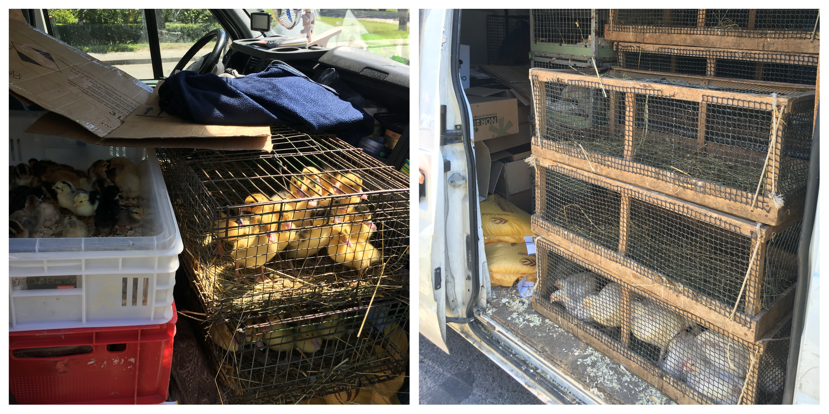 We stopped at a market in Kintai to buy some fruit and nuts for lunch. We later heard that everyone else pedaled just a little further down the road where there was a nice bakery with fresh pastries. Oh, well. Anyway, as we were eating, a man pulled up in an old van and started off-loading chickens. Dale went over to see what was going on. The guy had birds of all ages and types: