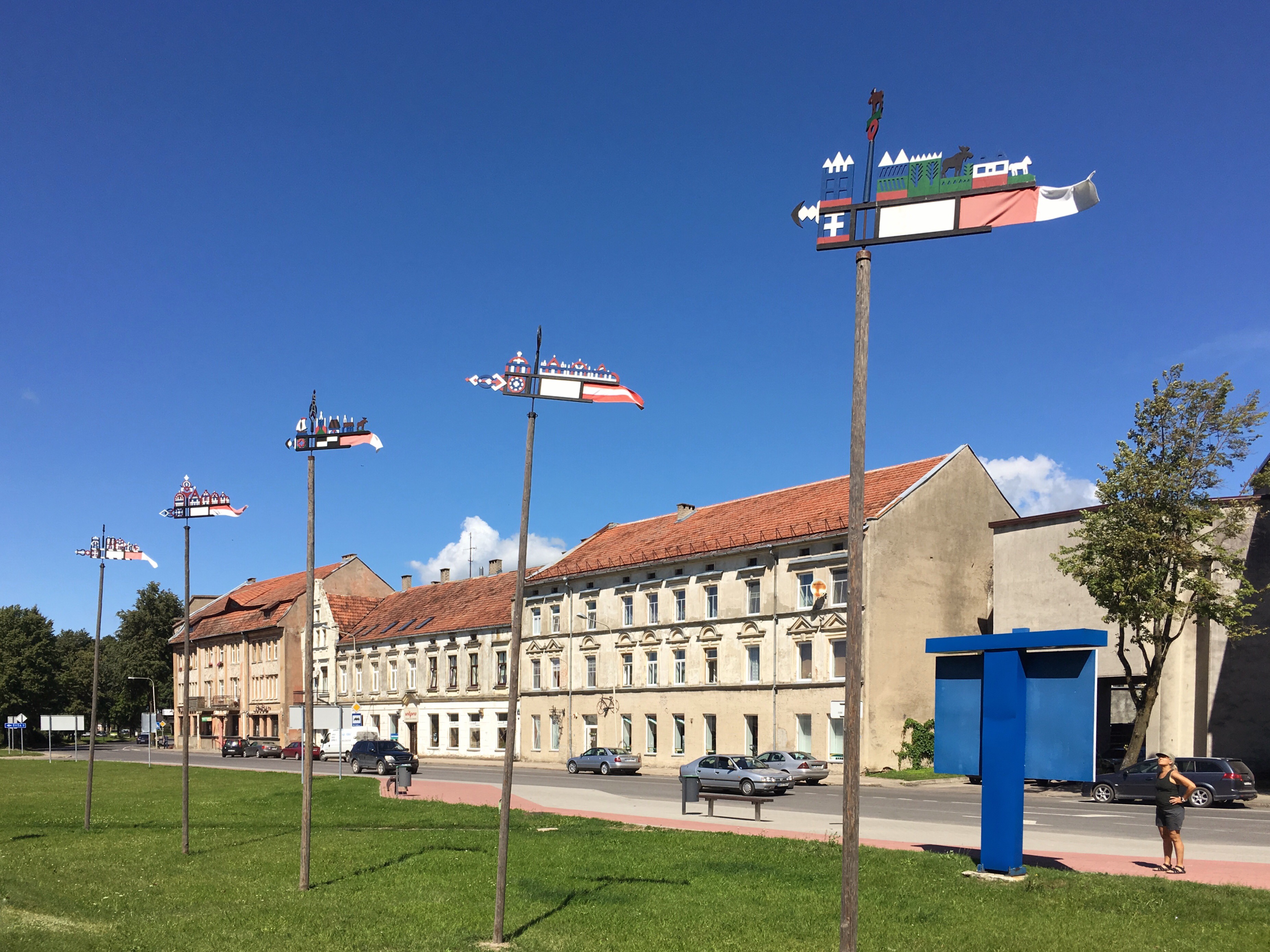After our little picnic, we continued inland to our designated meeting spot in Šilutė. Enroute, we bumped into the New Zealand couple, Stewart and Belinda, and compared itineraries; theirs said they were to meet the van in a different village, Rusne, about 8 km further down the road. Off they went. When we got to Šilutė, we found our van and driver and were soon joined by the rest of our group, with the exception of the New Zealanders. We walked around town and at one point admired the interesting windvanes they use here near the coast.
