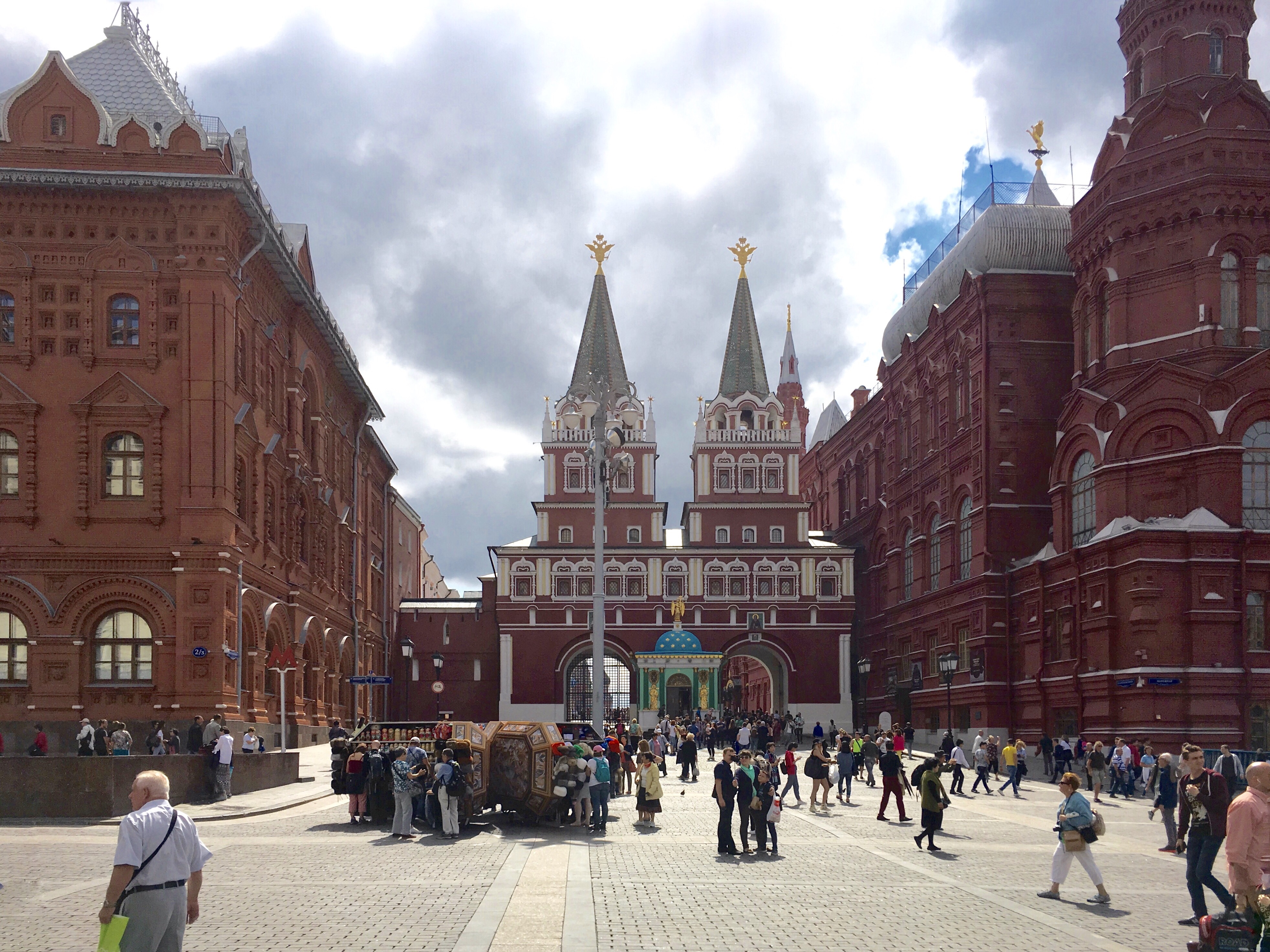 At the end of the 1812 Museum (on the left) is the Iberian Gate to Red Square (center; on the right is the State Historical Museum):