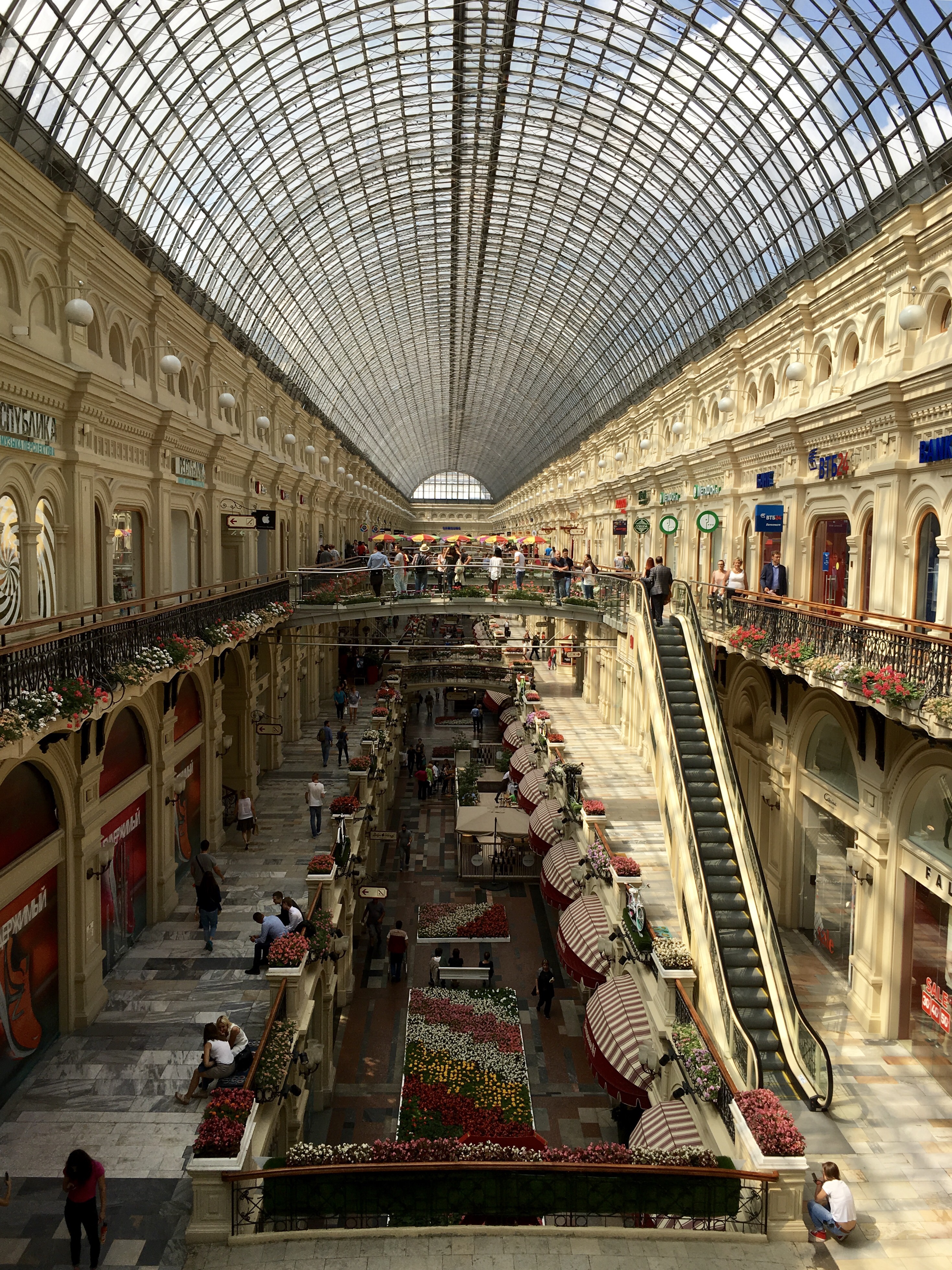 The name, GUM, is an acronym derived from its original Russian name: Государственный универсальный магазин, transcribed as: “Gosudarstvennyi Universalnyi Magazin,” translated as: “State Universal Store” or “State Department Store.” GUM was originally built in the 1890s as a trade center which, at the time of the Russian Revolution of 1917, contained 1,200 stores. It was soon nationalized by the Soviets, continued briefly as a market, then converted by Stalin in 1928 into offices. It was reopened as a department store by the Soviets in 1953 and ultimately privatized and redeveloped as the shopping mall it now is in 2005, at which time the word Glavnyi, meaning “Main,” was substituted for Gosudarstvennyi, meaning “State,” so that GUM is now the “Main Universal Store” in Moscow. It’s the most decadent shopping mall I’ve ever been in.