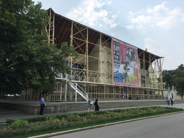 On our walk back to the entry arch, Joel mentioned that during the Kruschev years (1953-1964), a number of the pavillions were ordered to be demolished so that newer pavillions could be constructed. But, the architects in charge of the project felt that the original buildings were worth saving, so without letting Kruschev know what they were doing, they designed “boxes,” that is, façades, to encapsulate the buildings, thus preserving the original structures, some of which are now being restored, while others remain encased in their “boxes:”