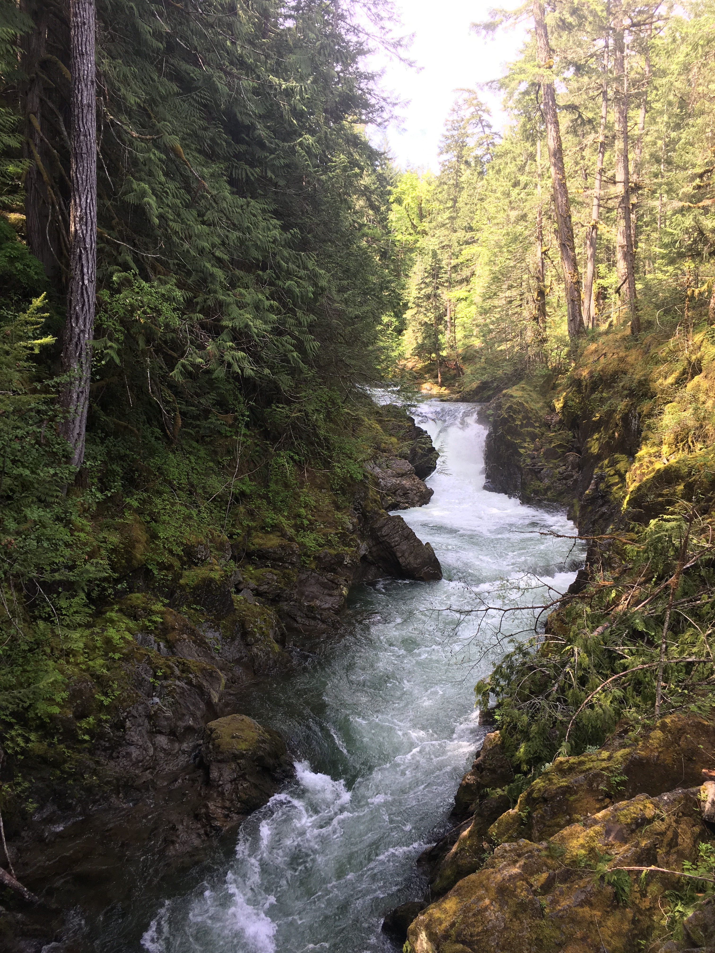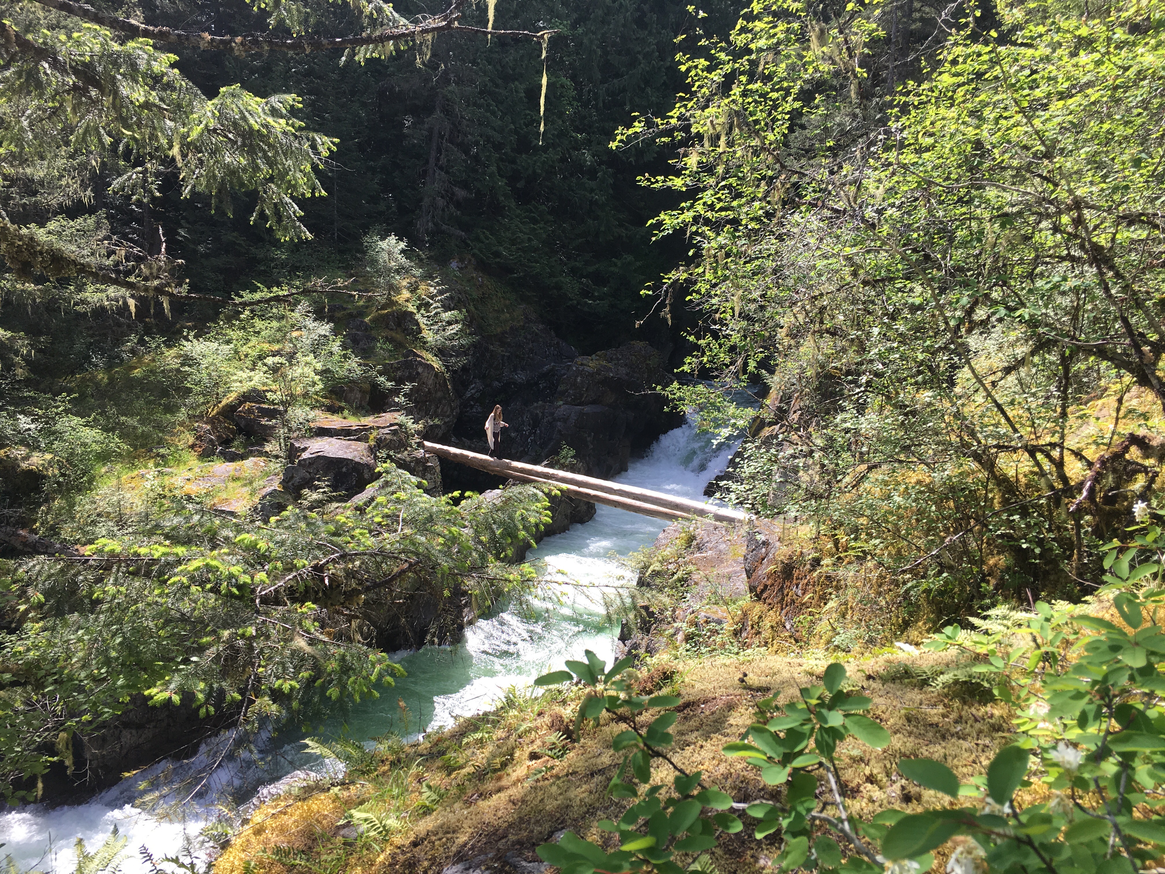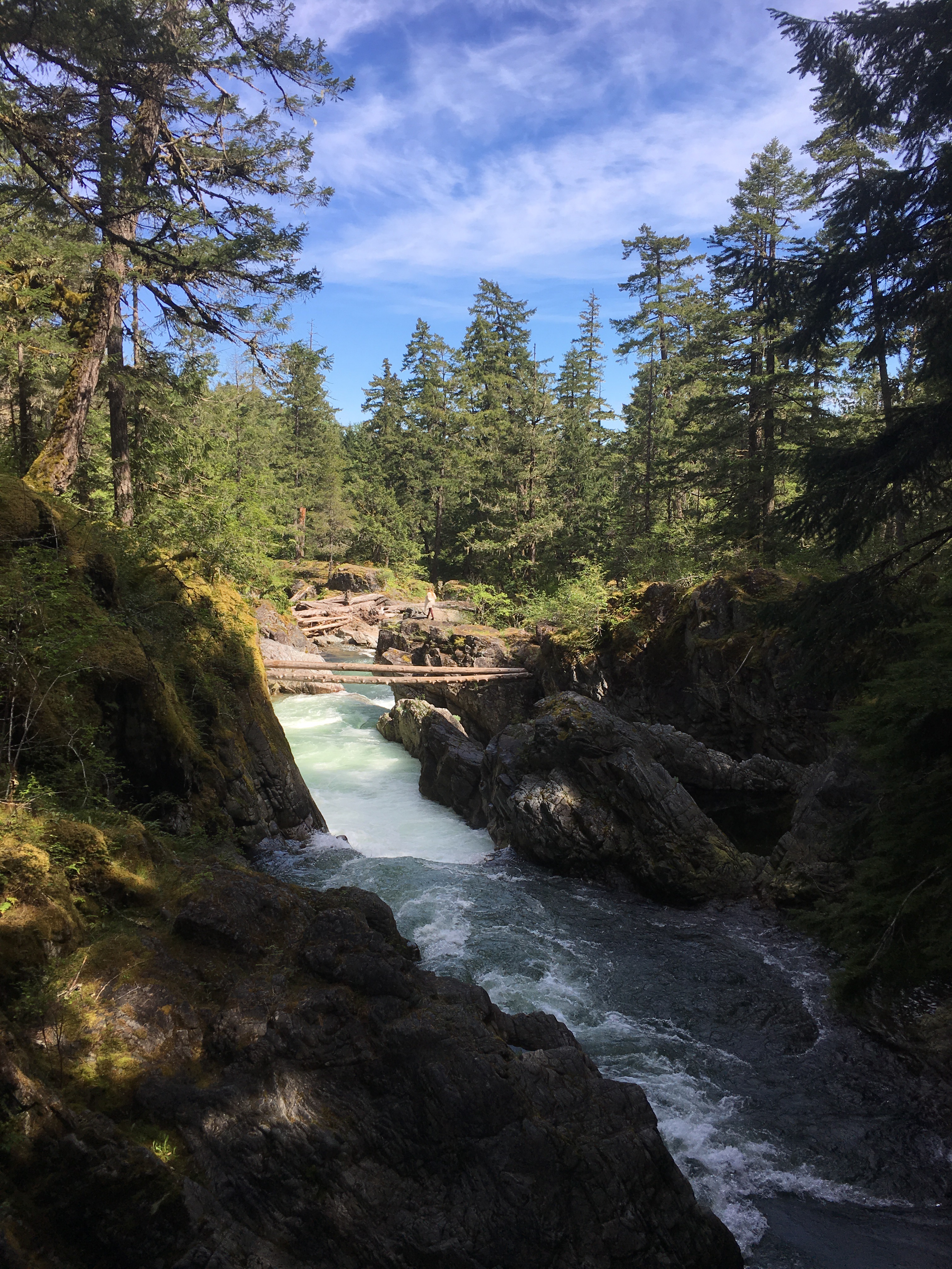 Along the way, we decided to stop for a short hike out to see Little Qualicum Falls. Here’s a view looking up the Little Qualicum River from the pedestrian bridge that crosses it:
