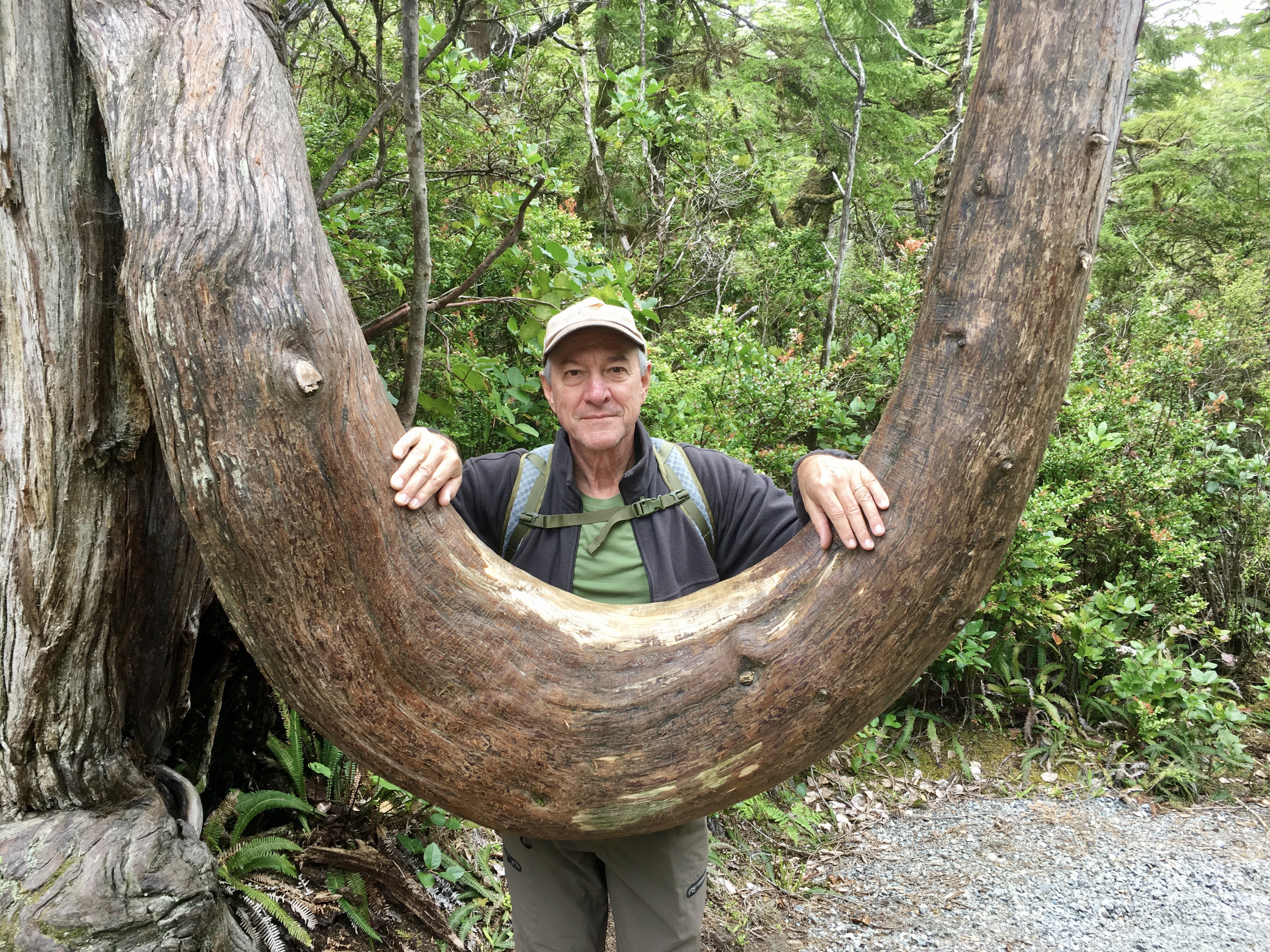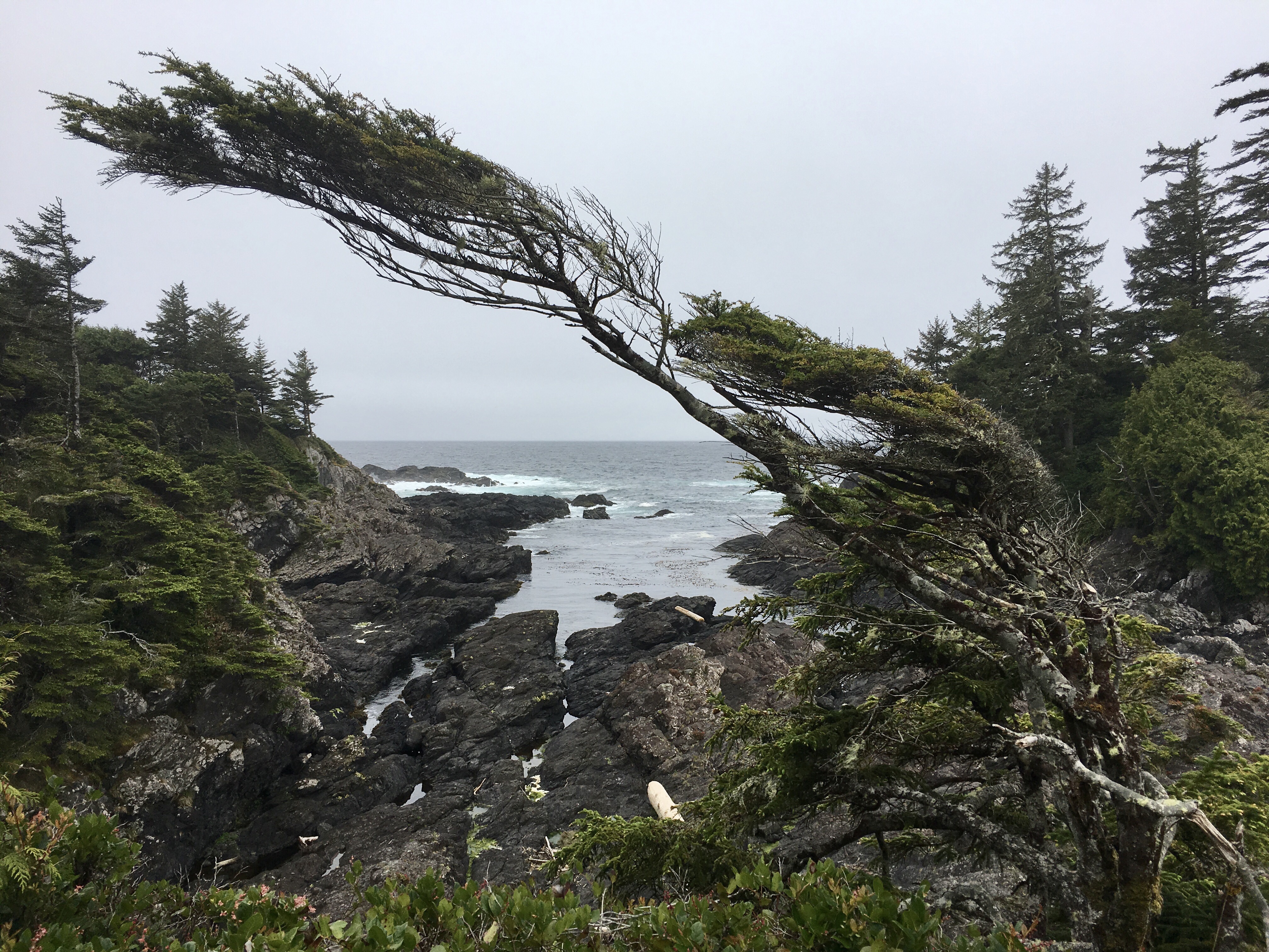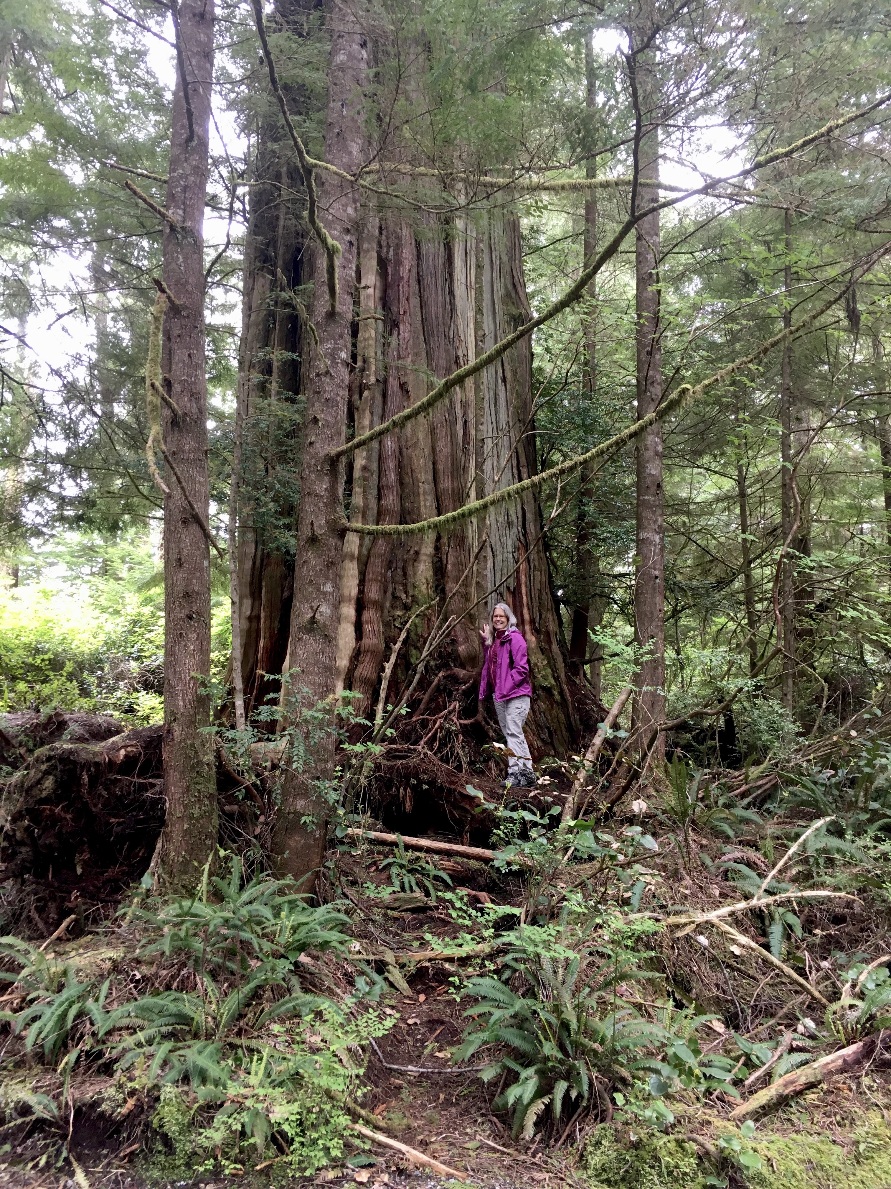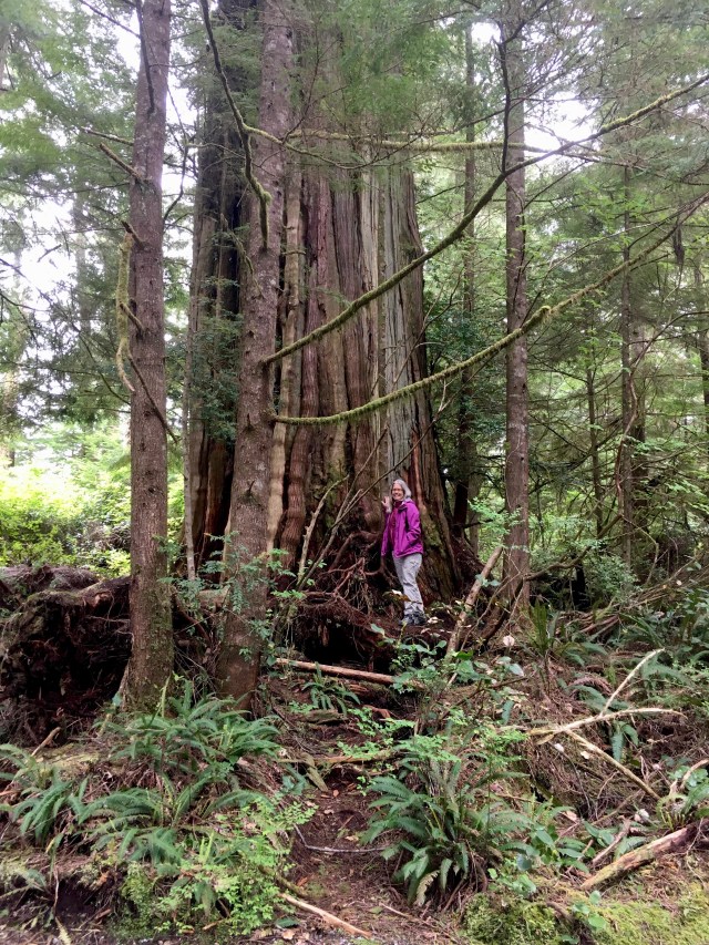 The hike took about 1.5 hours with side excursions to the many viewpoints and scrambles down to the water and we made it back to the car just as it started to rain. That turned out to be a good excuse to stop in town for lunch before our second hike of the day through the Ancient Cedars and Artist Loops sections of the Wild Pacific Trail. Here’s one of those ancient cedars: