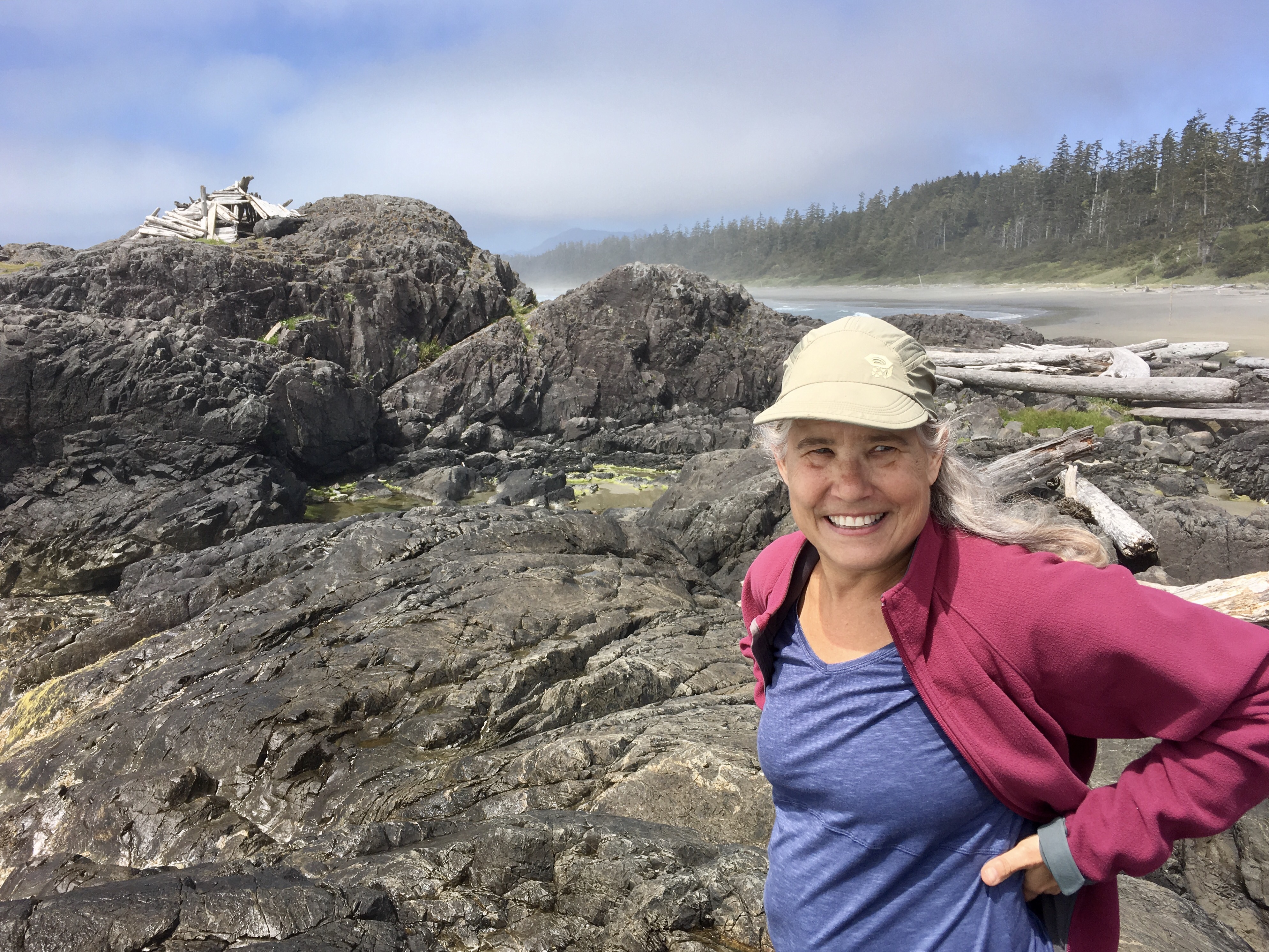We walked the entire length of Long Beach, 2.5 miles, from Incinerator Rock to the rock outcropping at Green Point where someone had built a shelter out of driftwood: