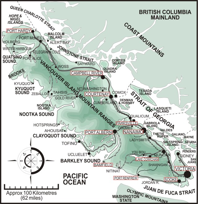 We spent the day driving from Tofino on the Pacific coast, over the Vancouver Island Mountain Range to Parksville on the Strait of Georgia on the east coast, then north on BC19 to Campbell River.