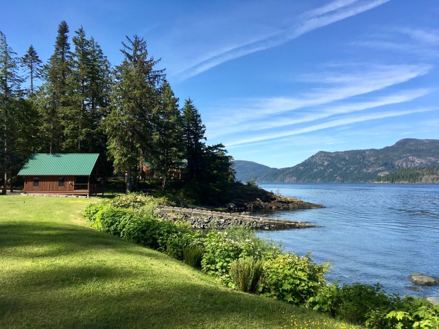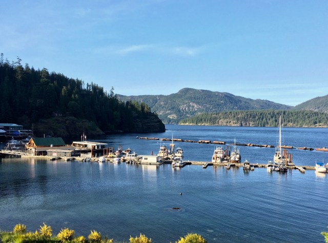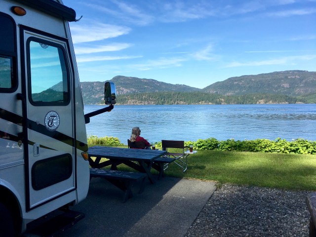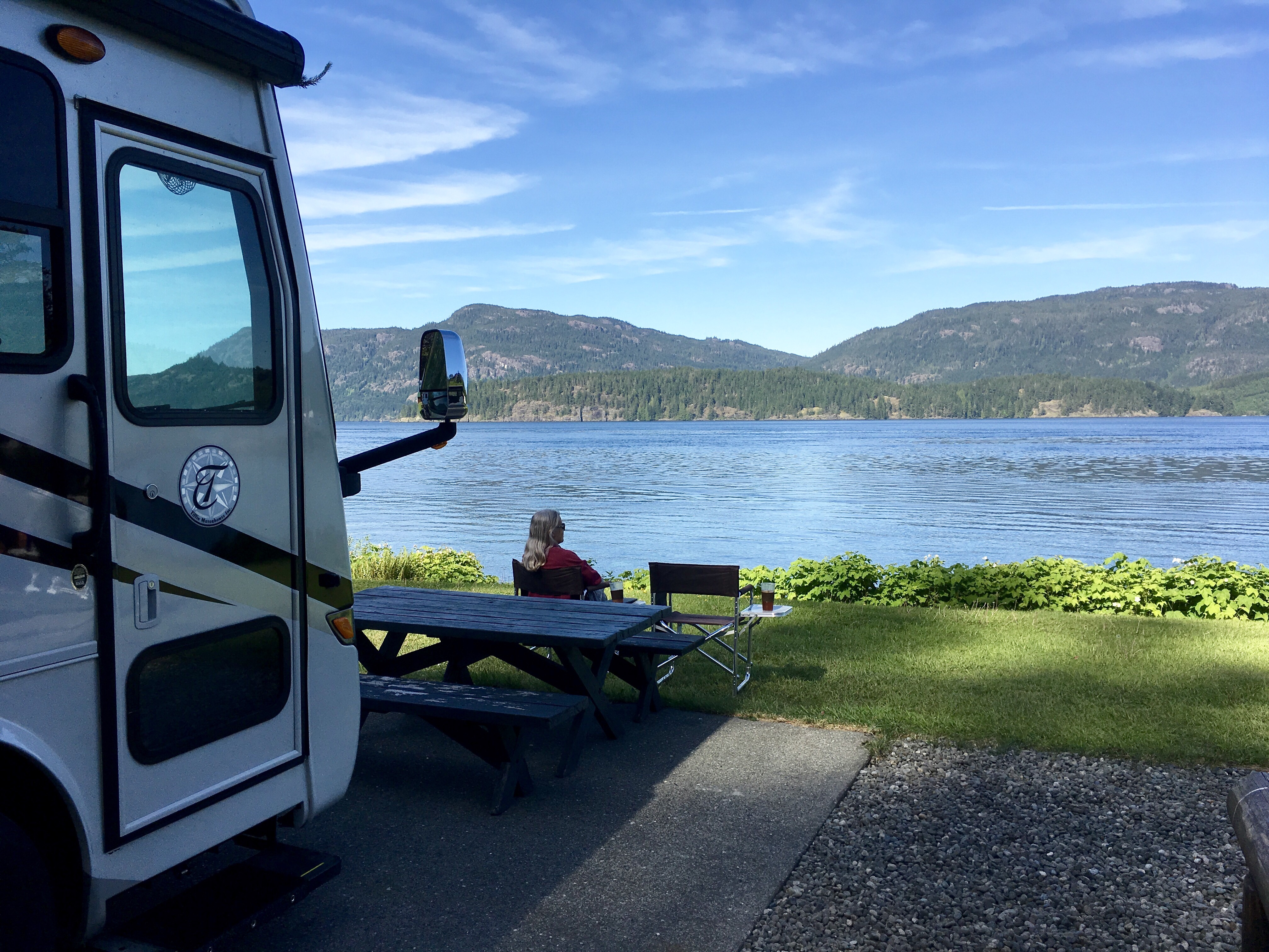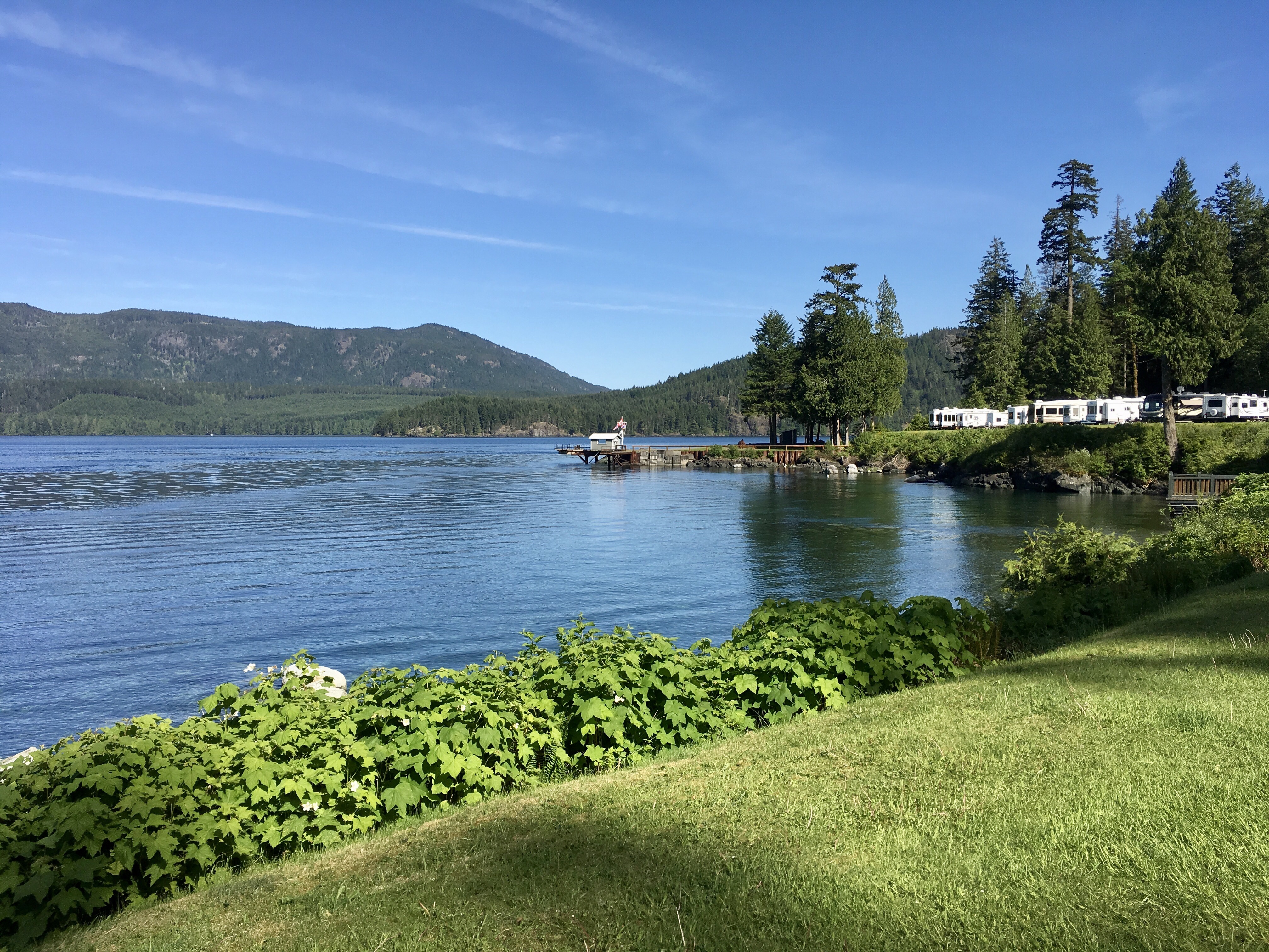 We arrived at our destination, Ripple Rock RV Park at Brown’s Bay Marina, around 4:00 in the afternoon with plenty of time left to enjoy the view of the Coast Mountains and Quadra Island across the Johnstone Strait: