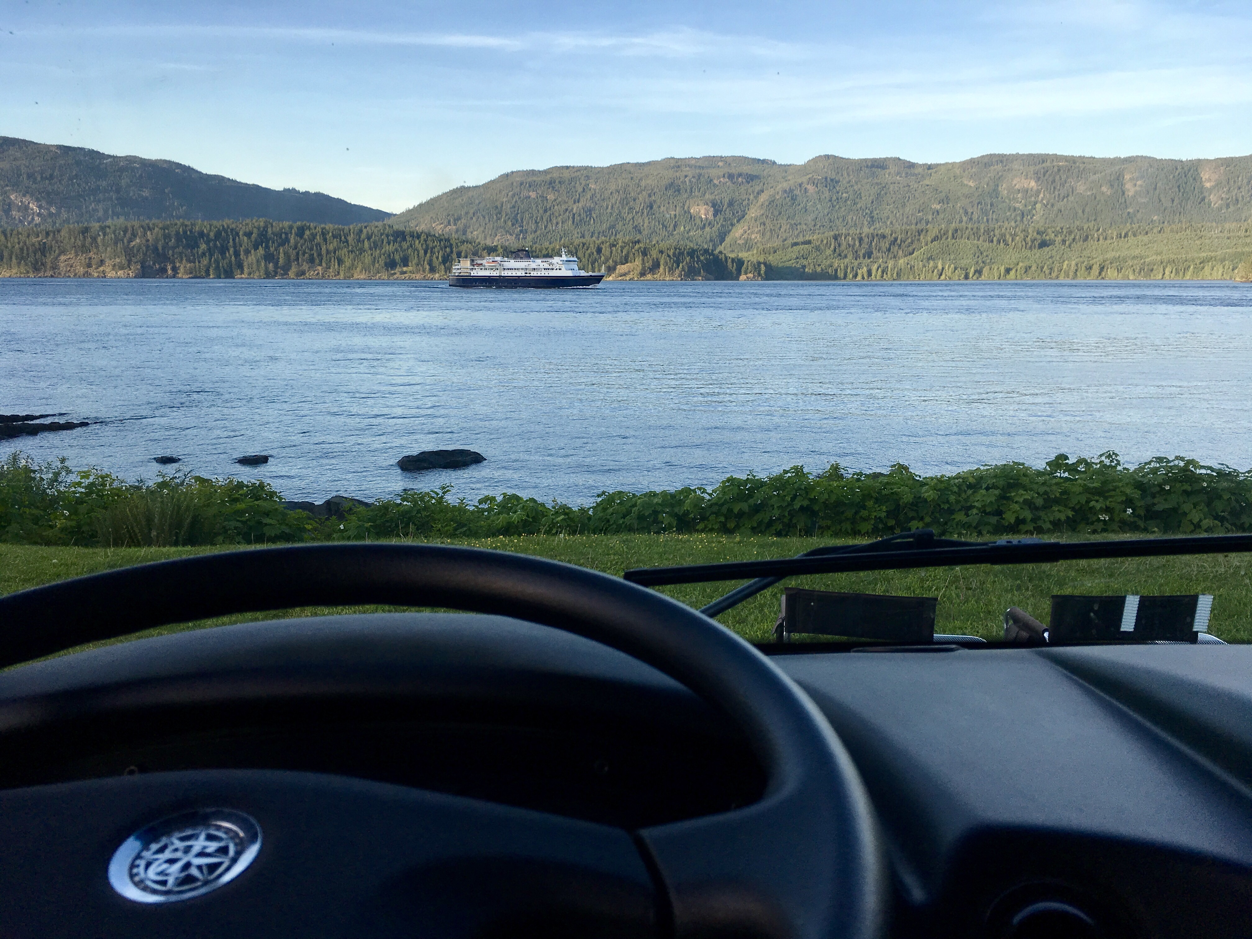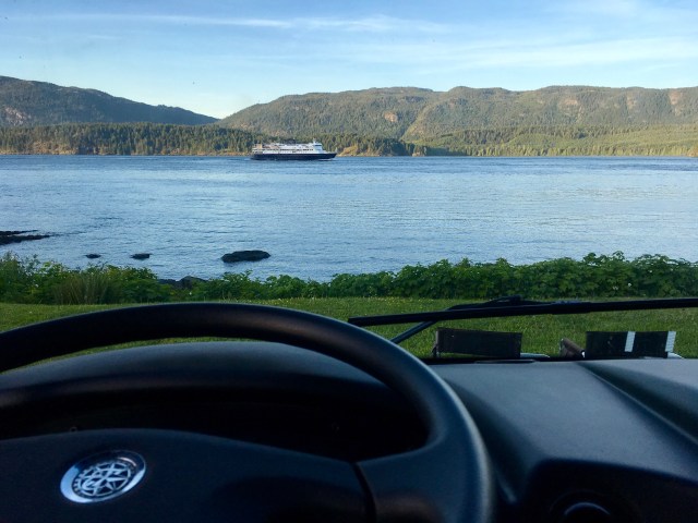 It occured to me that the Alaska Ferry that leaves from Fairhaven Harbor in Bellingham might take this route, so I looked it up. Sure enough, it does, and an app I have on my iPhone showed that it was just about to pass by on its way back from Juneau! We finished dinner and headed back to the RV and not long after, along came the 380-foot Kennicott. I took this photo of it passing by from the driver’s seat of our RV.