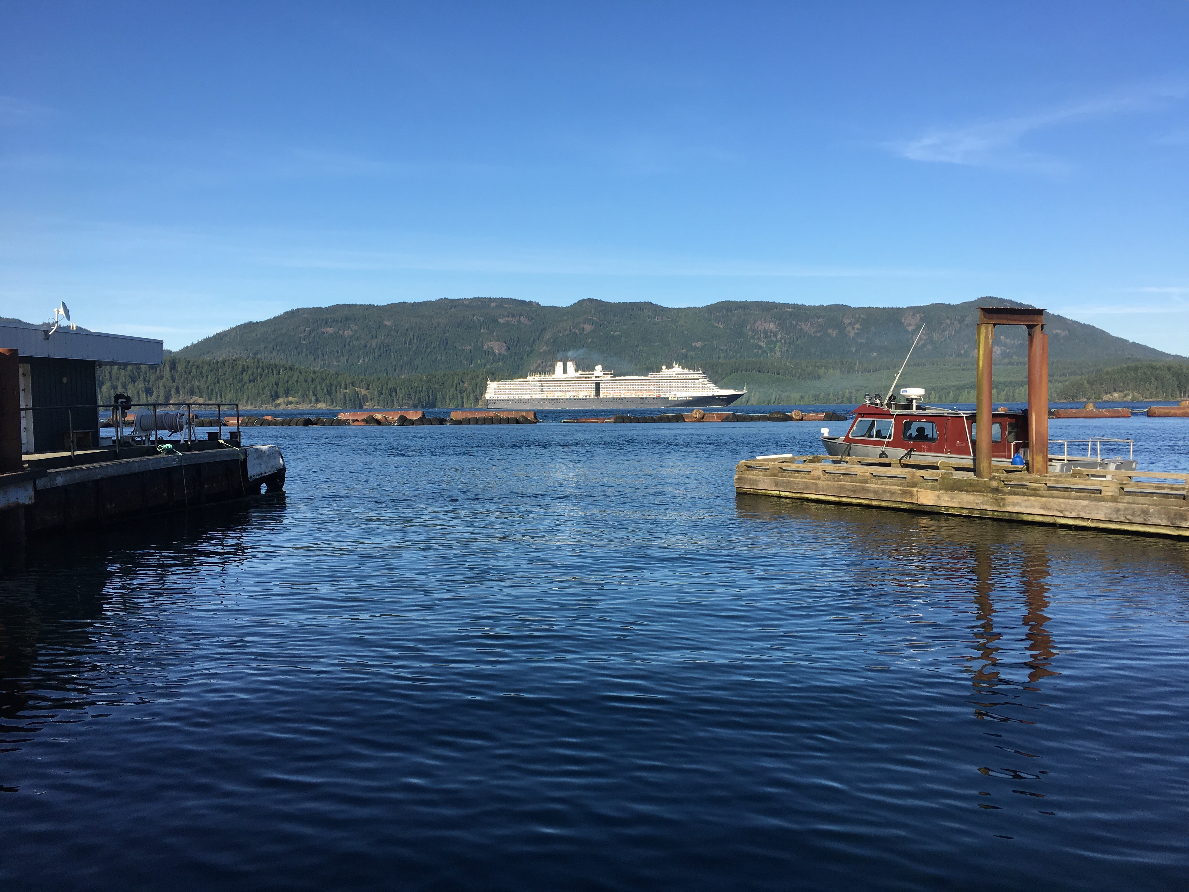 The Johnstone and Georgia Straits together make up a deep water passage to Alaska, known as the Discovery Passage. The narrowest part of the route is right here where the two straits meet at Quadra Island, the Seymour Narrows. We sat and ordered fried cod and a seafood stew, when this cruiseship appeared, so I jumped up from the table to take its picture.