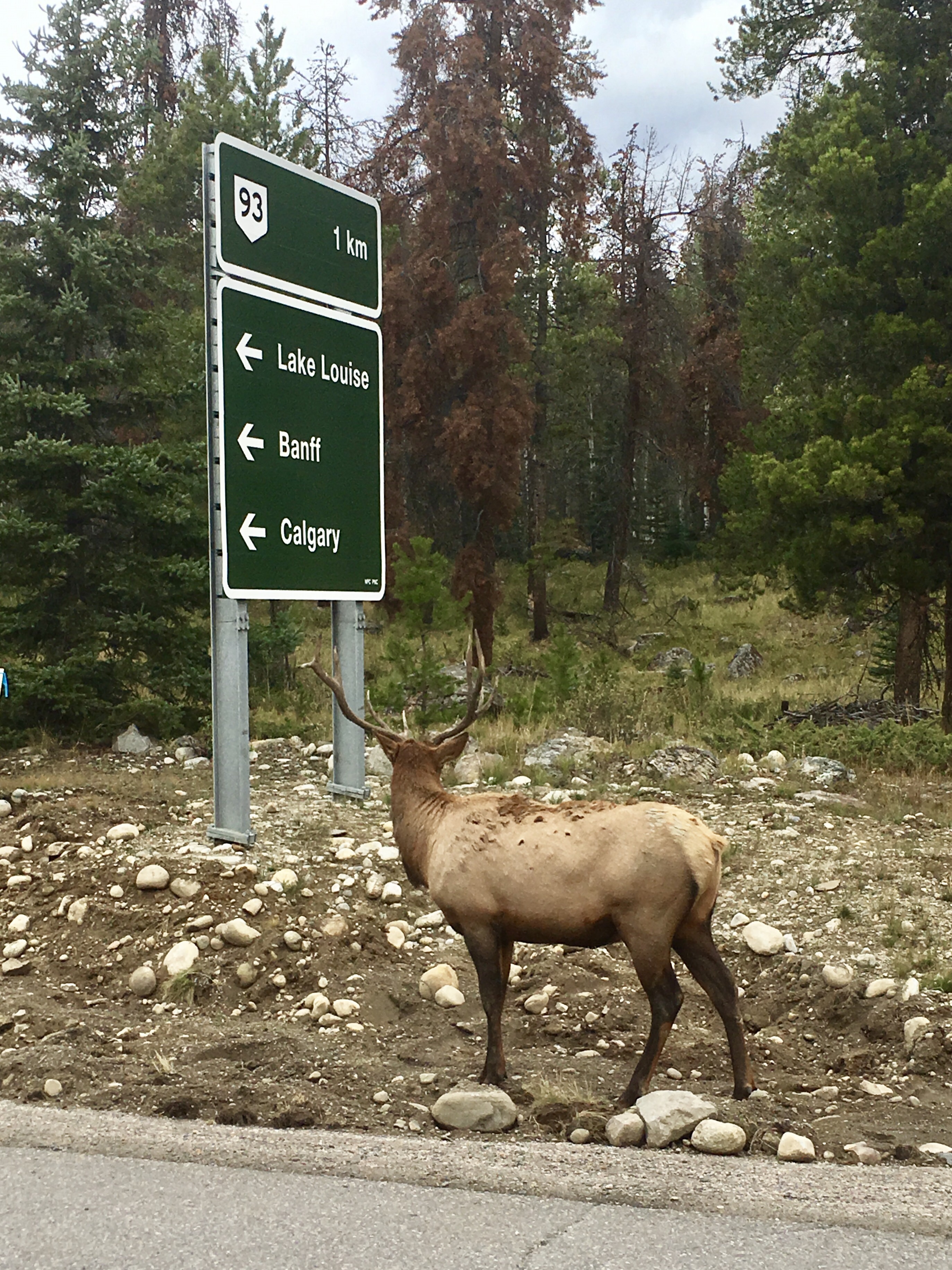 On our drive out to Jasper, the “low battery” light went on. Diagnostics on Tuesday showed that our chassis batteries needed to be replaced. Fortunately, there’s a NAPA auto parts store in Jasper where I was able to get the exact pair of batteries we needed, replacing the old ones in the RV without incident – a surprise, since the cabinet they are in is so tight. But that left us with only a half-day for hiking and the best place for that was Maligne Canyon, just east of town. On the drive out, we saw our first elk. It looked like he was trying to decide whether it was worth the trouble to head south to Banff and Lake Louise.