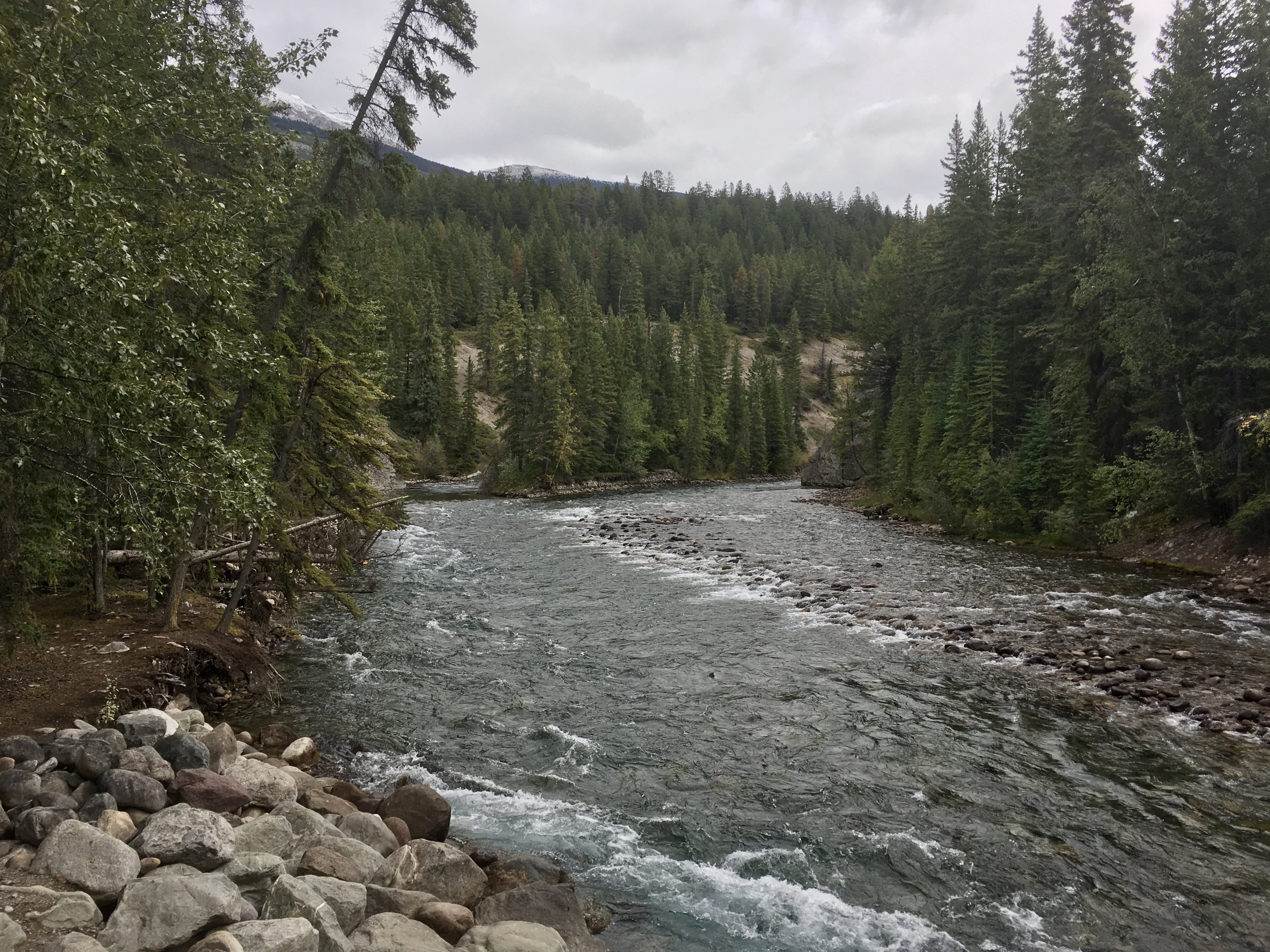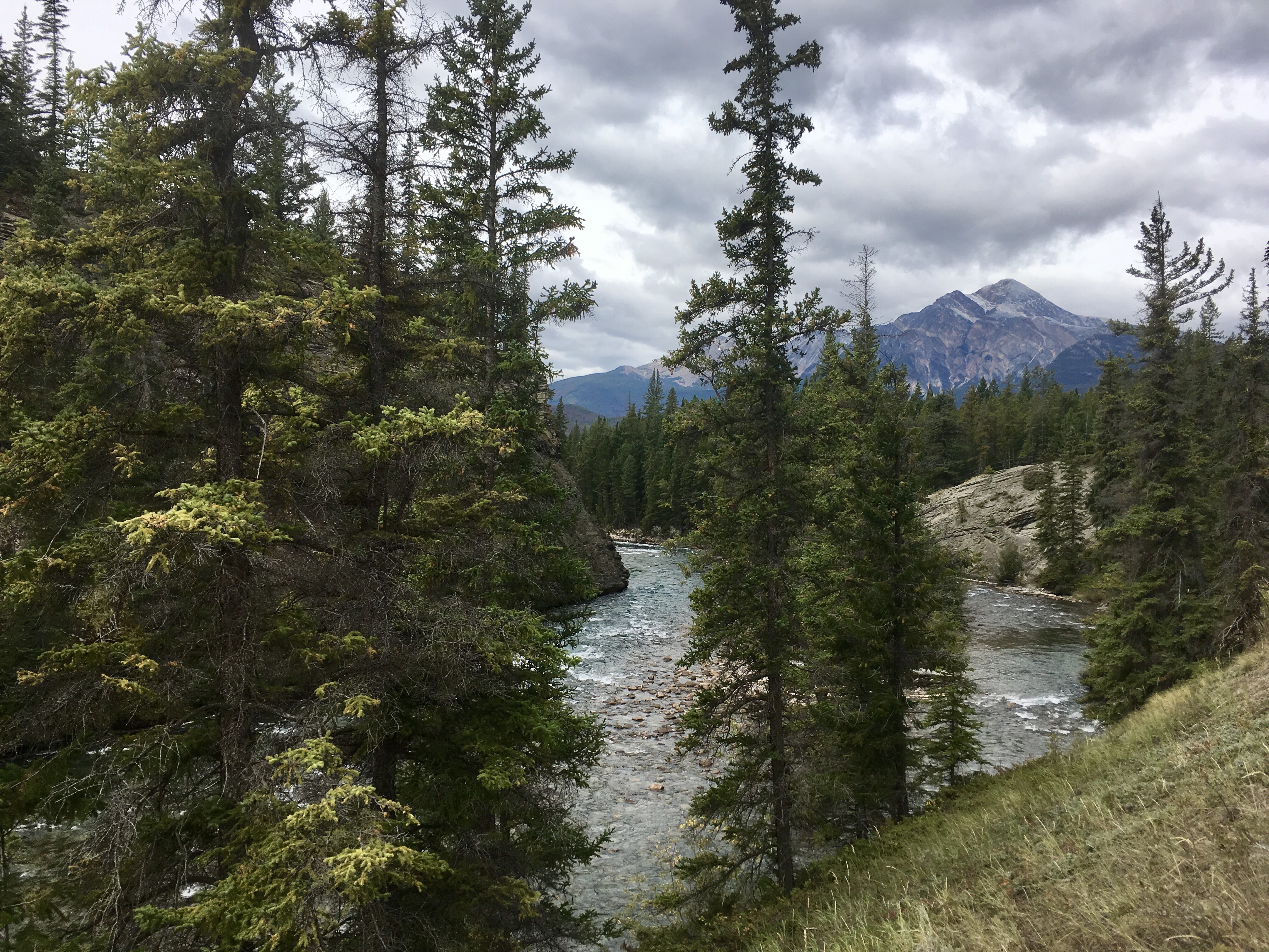 Something else I need to point out in the photo, above. Notice that the hill in the distance to the left is brown. Like most of the hills and mountainsides surrounding Jasper, it was previously covered with Lodgepole Pines, but thousands of acres of Lodgepoles have been killed by the Mountain Pine Beetle, a true scourge throughout Western Canada. Most of the Lodgepole Pines in the campground we are staying in are dead or dying as a result of the beetle. The problem is attributed, in part, to monoculture planting and fire suppression. Sad.