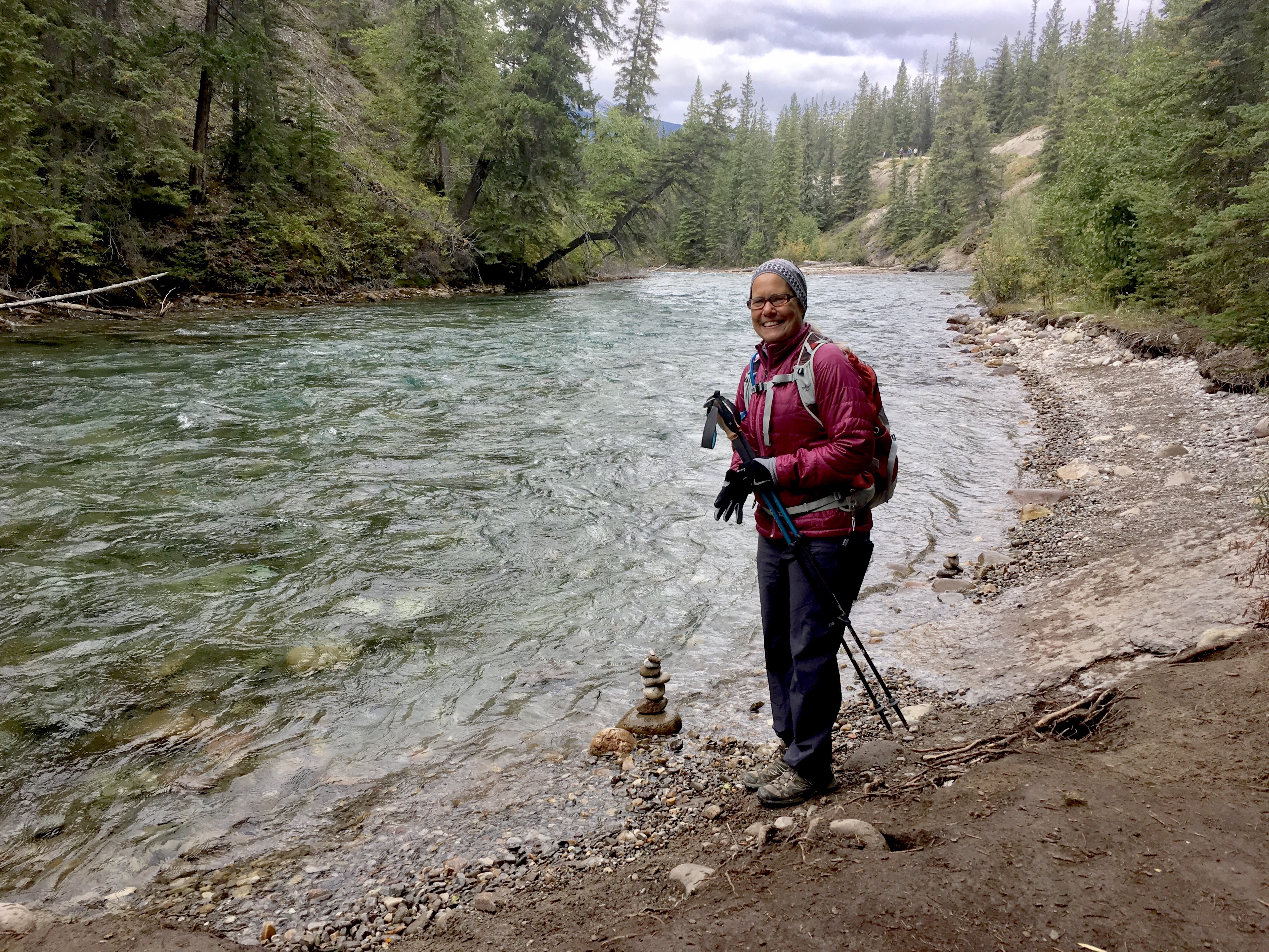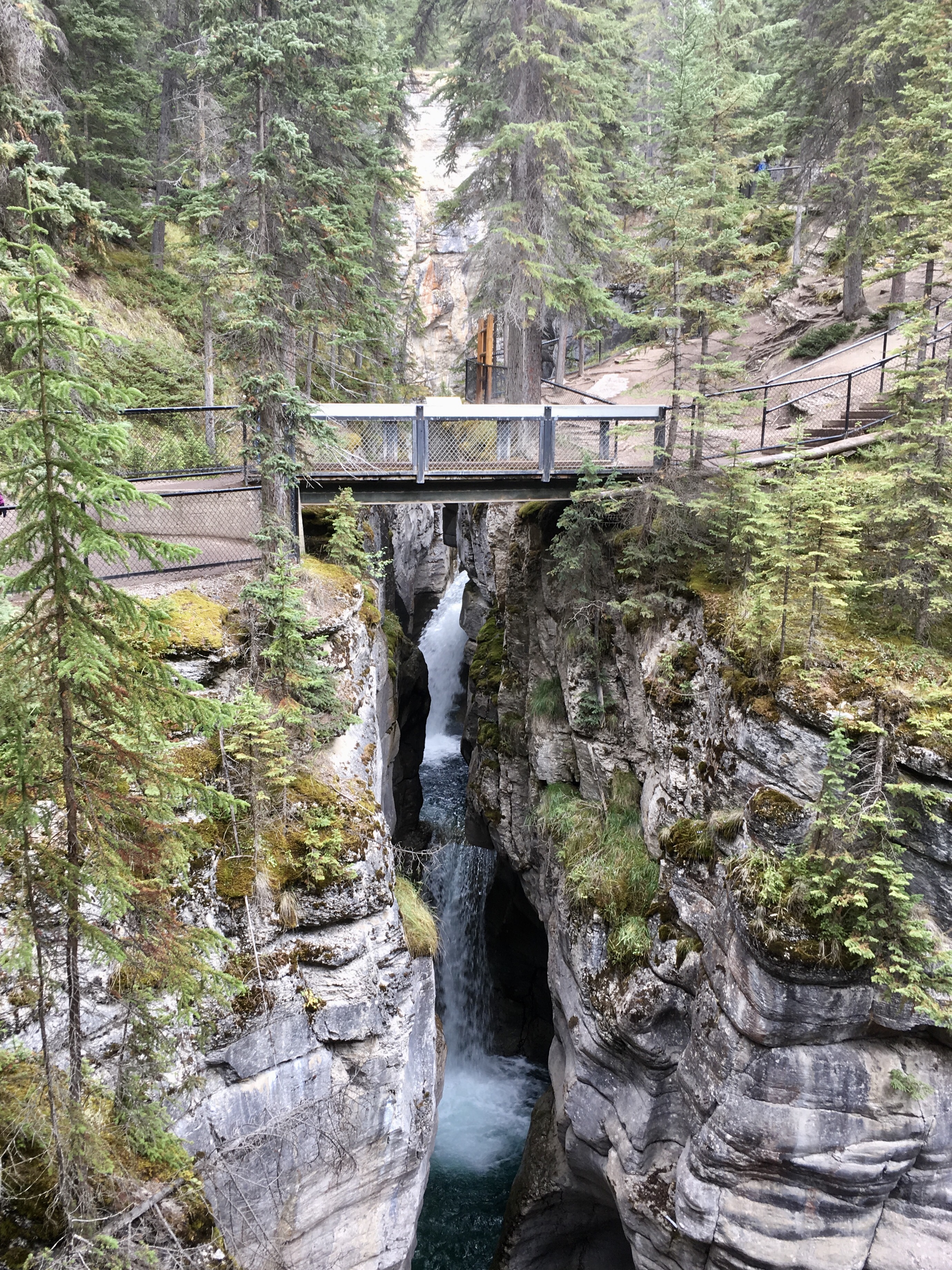 Maligne Canyon (pronounced “Ma Lean”) is crossed by six bridges, referred to by number and starting on the east at a heavily trafficked visitor center and restaurant at First Bridge. We started our hike at the west end at Fifth Bridge, hiking uphill on the north bank.