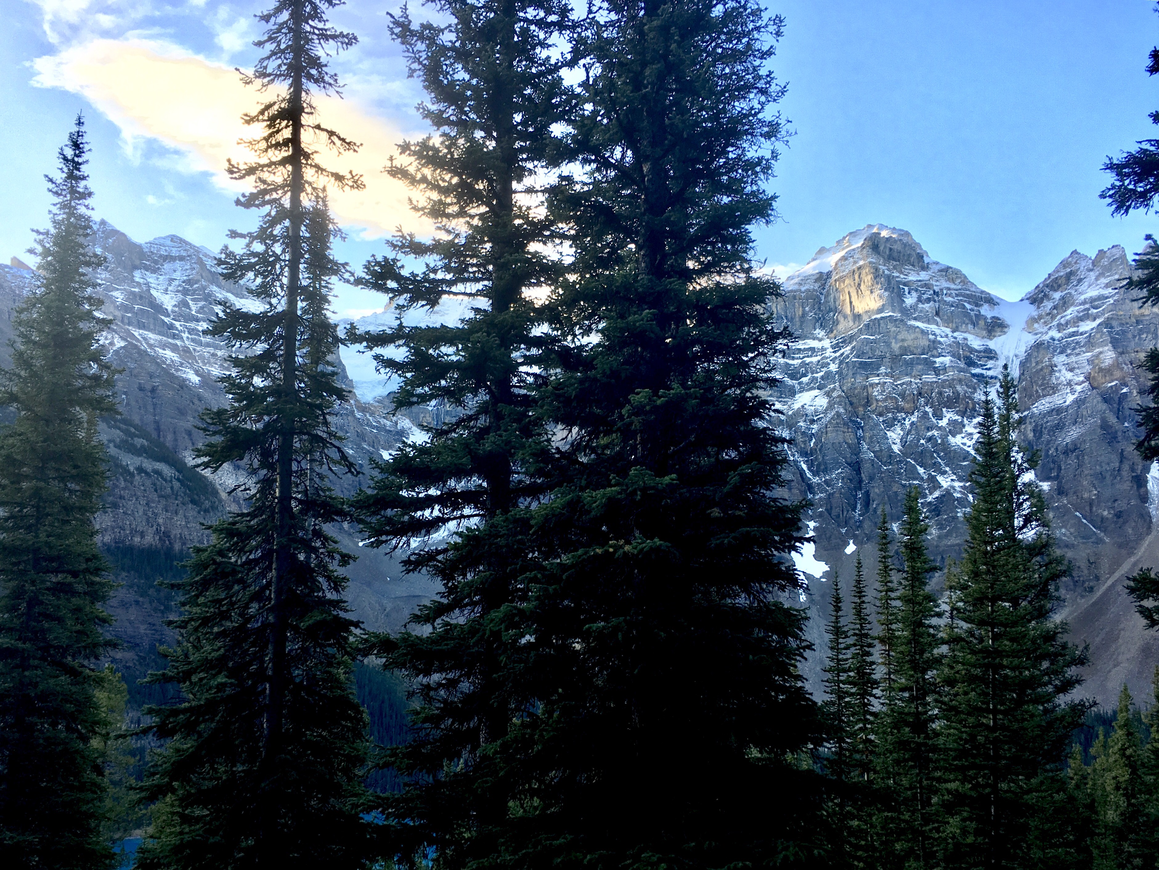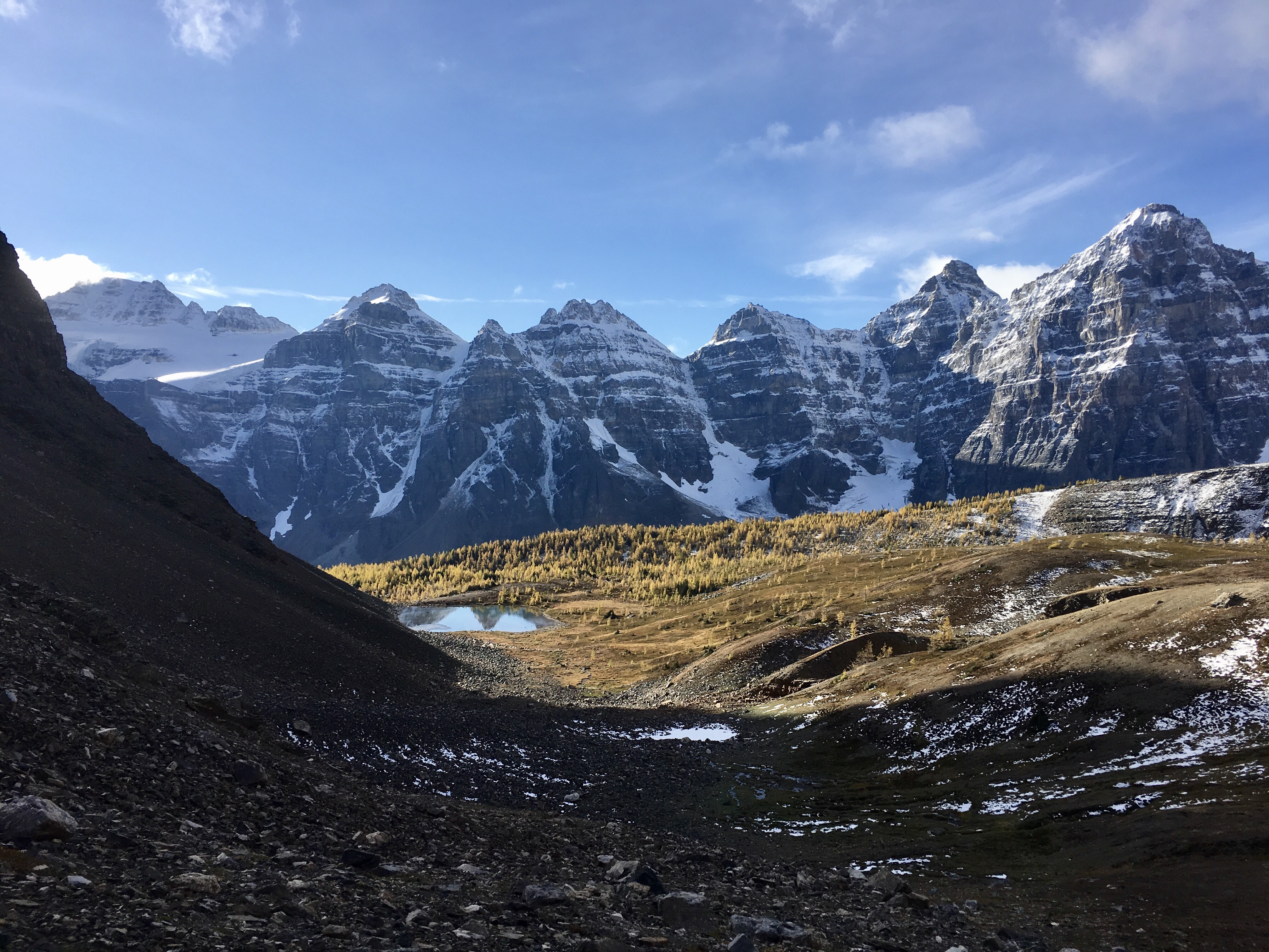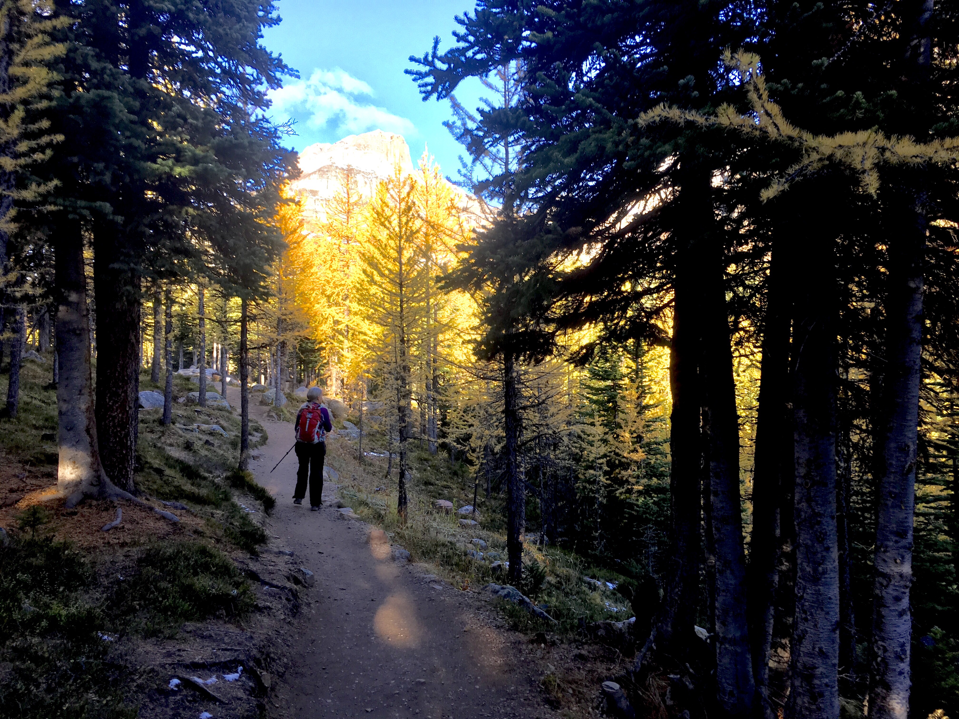 Moraine Lake, Larch Valley and Sentinel Pass are all in Banff National Park, Canada’s oldest national park, founded in 1885. The trail up to Larch Valley switched back and forth through a forest of firs a number of times before suddenly opening up with a splash of gold, our first close encounter with larches.