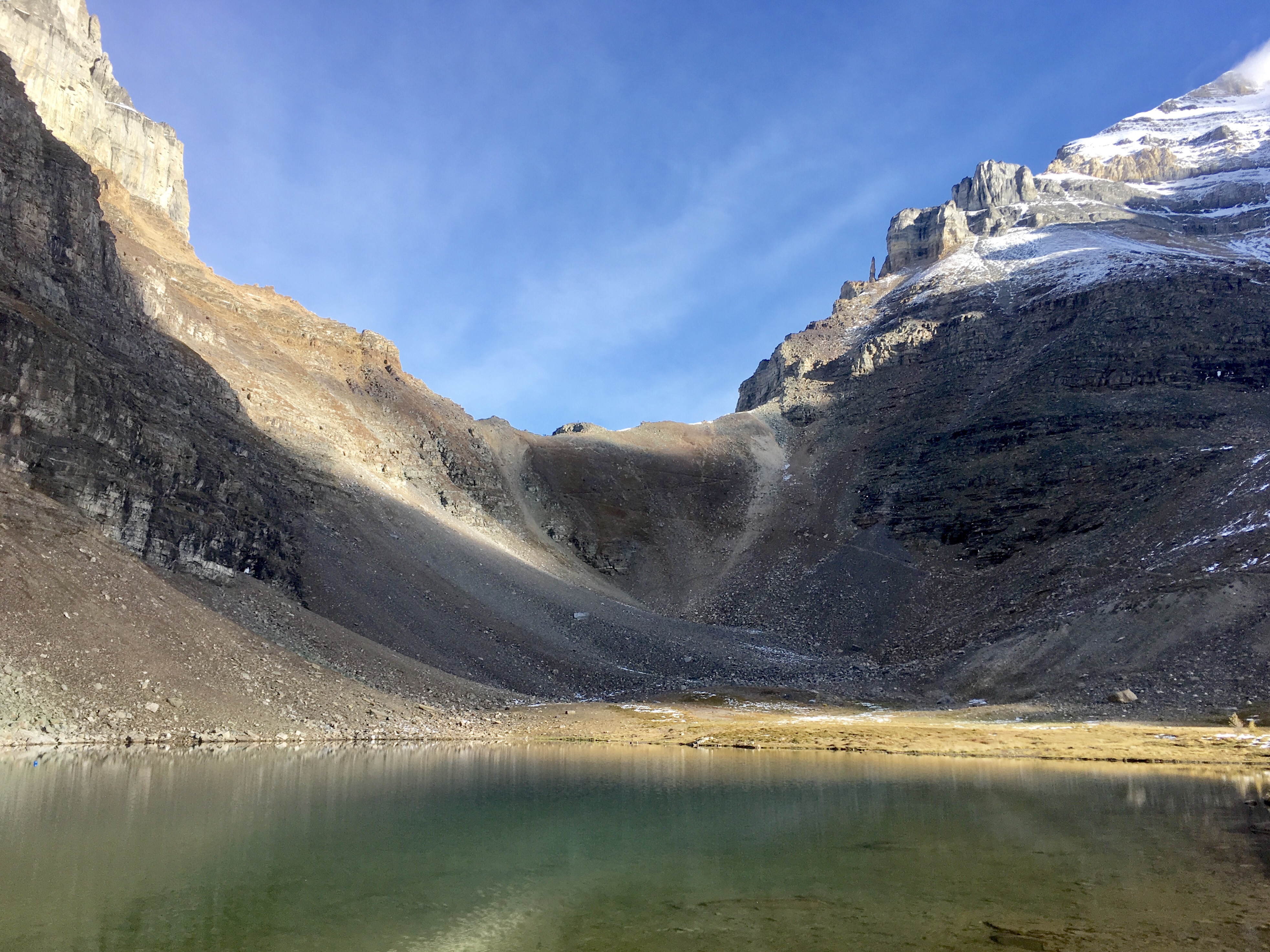 The trail to the pass is not for the faint-of-heart, winding to the right around the lake and then making several switchbacks over loose gravel and stones at a severe angle. If you look closely, below, you should be able to make out the switchbacks.