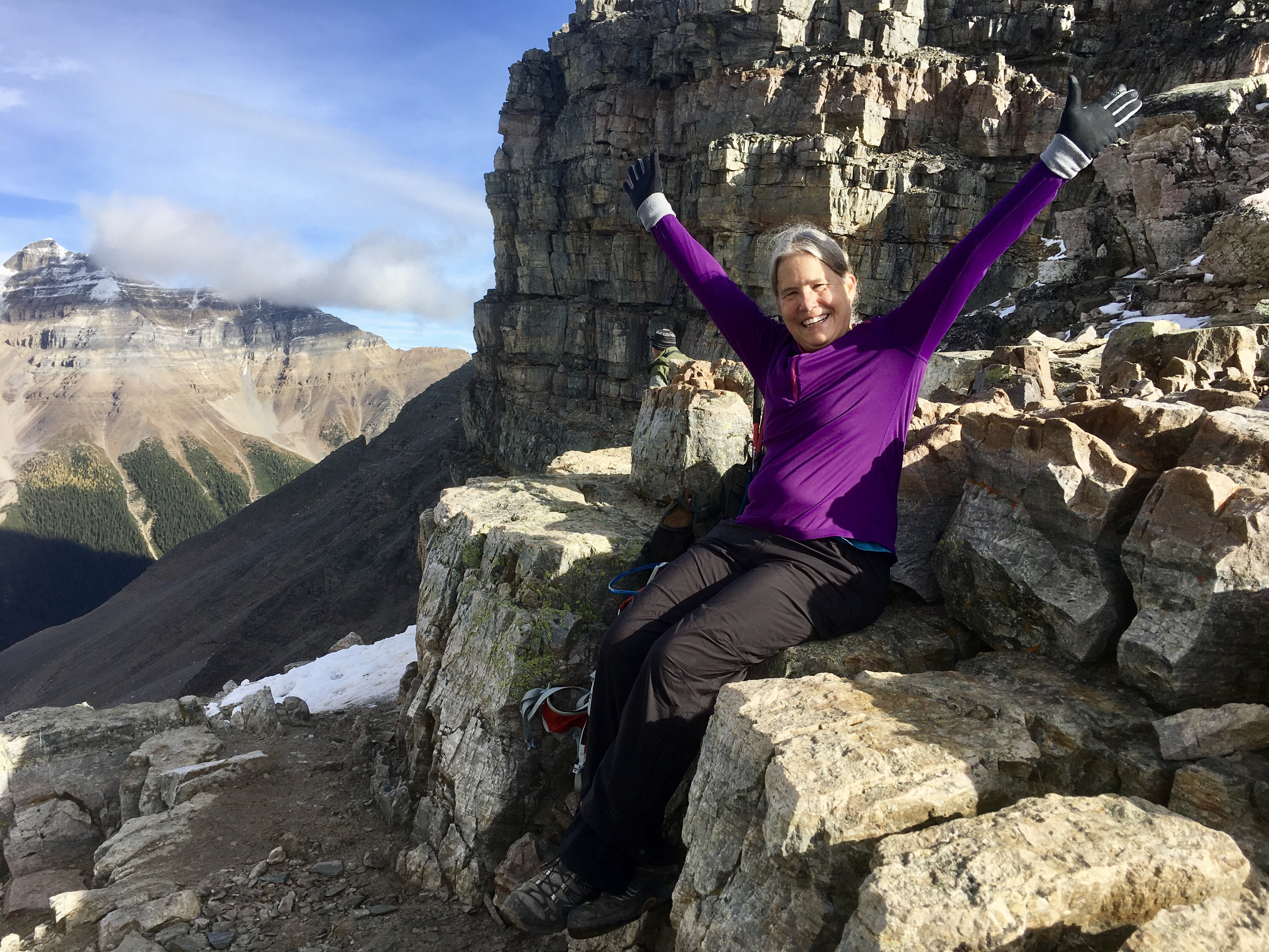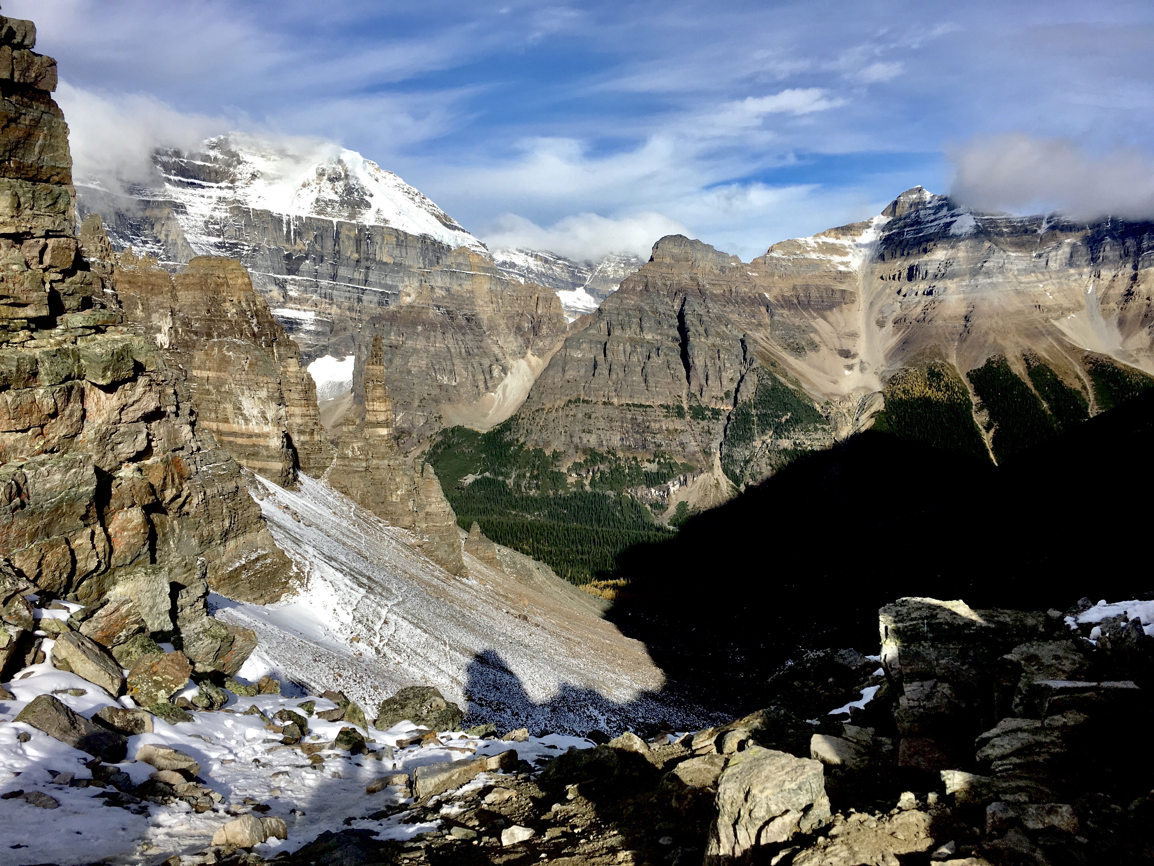 There were times on the hike up that I had a sensation of vertigo, probably a result of the tilted horizon, coupled with my myopic focus on the narrow trail. I assume Dale had the same experience, but we weren’t talking to each other as we hiked this segment; we were concentrating on keeping our footing. But we made it to the top and the view of the Wenkchemna Peaks, towering above Larch Valley, below, made it worth the effort.