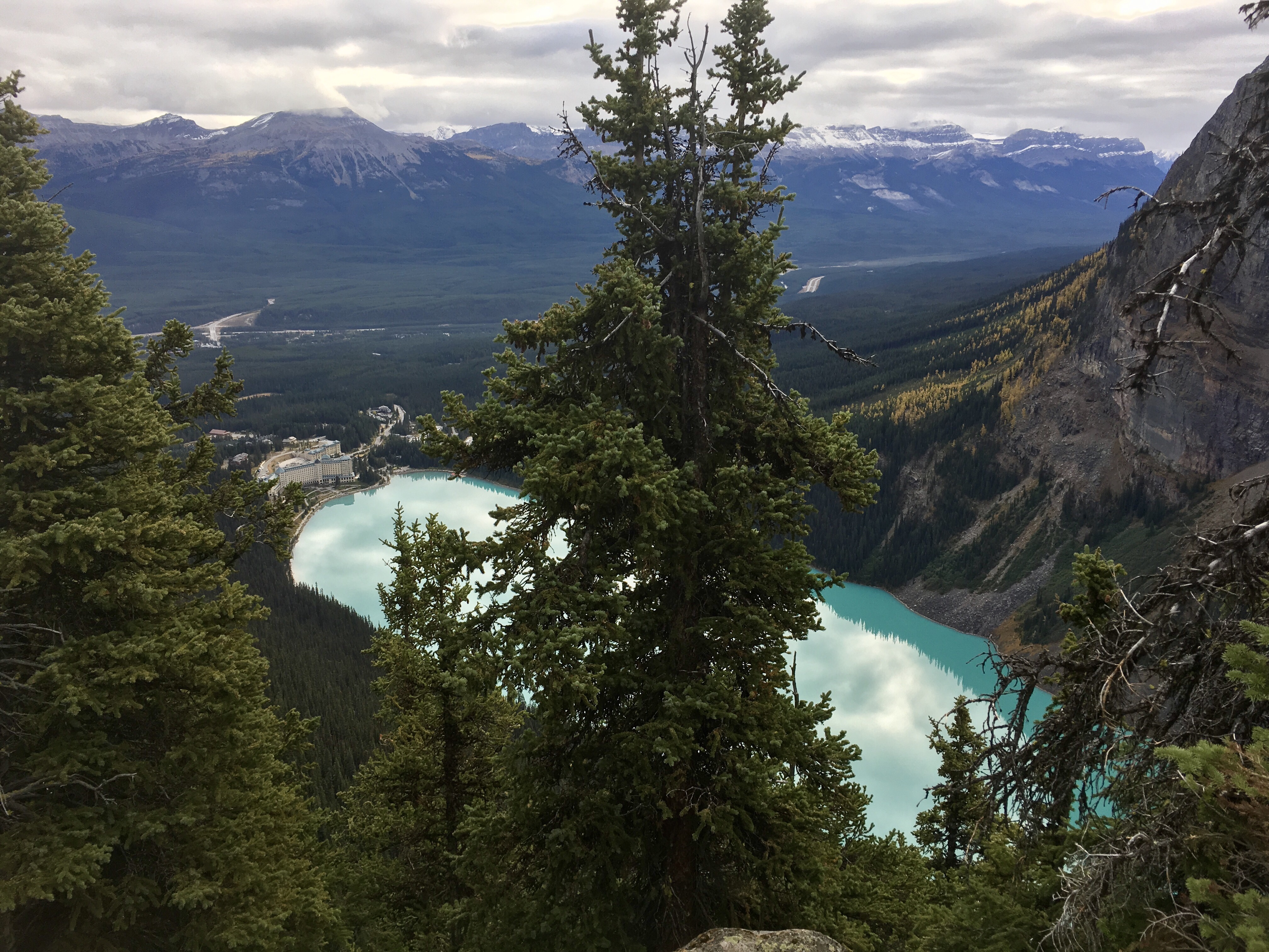 … from which the vista includes the Fairmont resort, the Lake Louise junction with the Icefields Parkway, and even our campground.