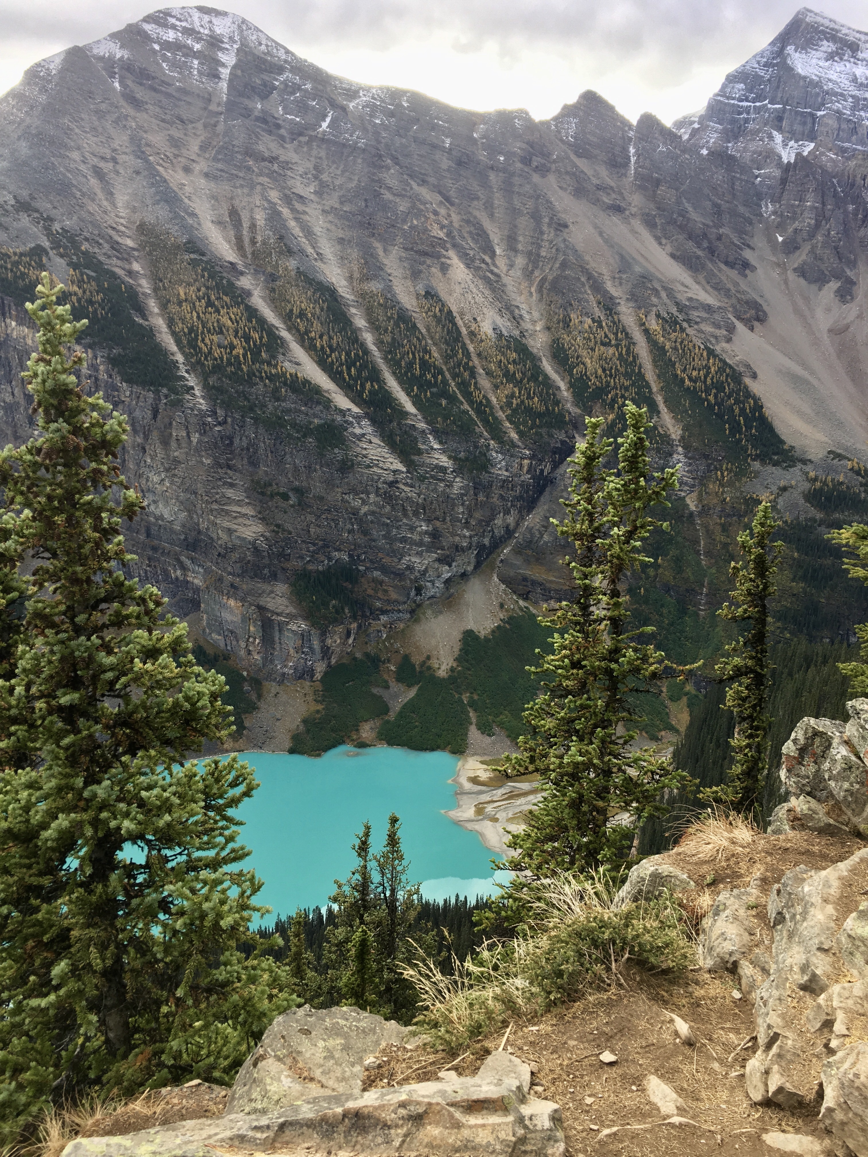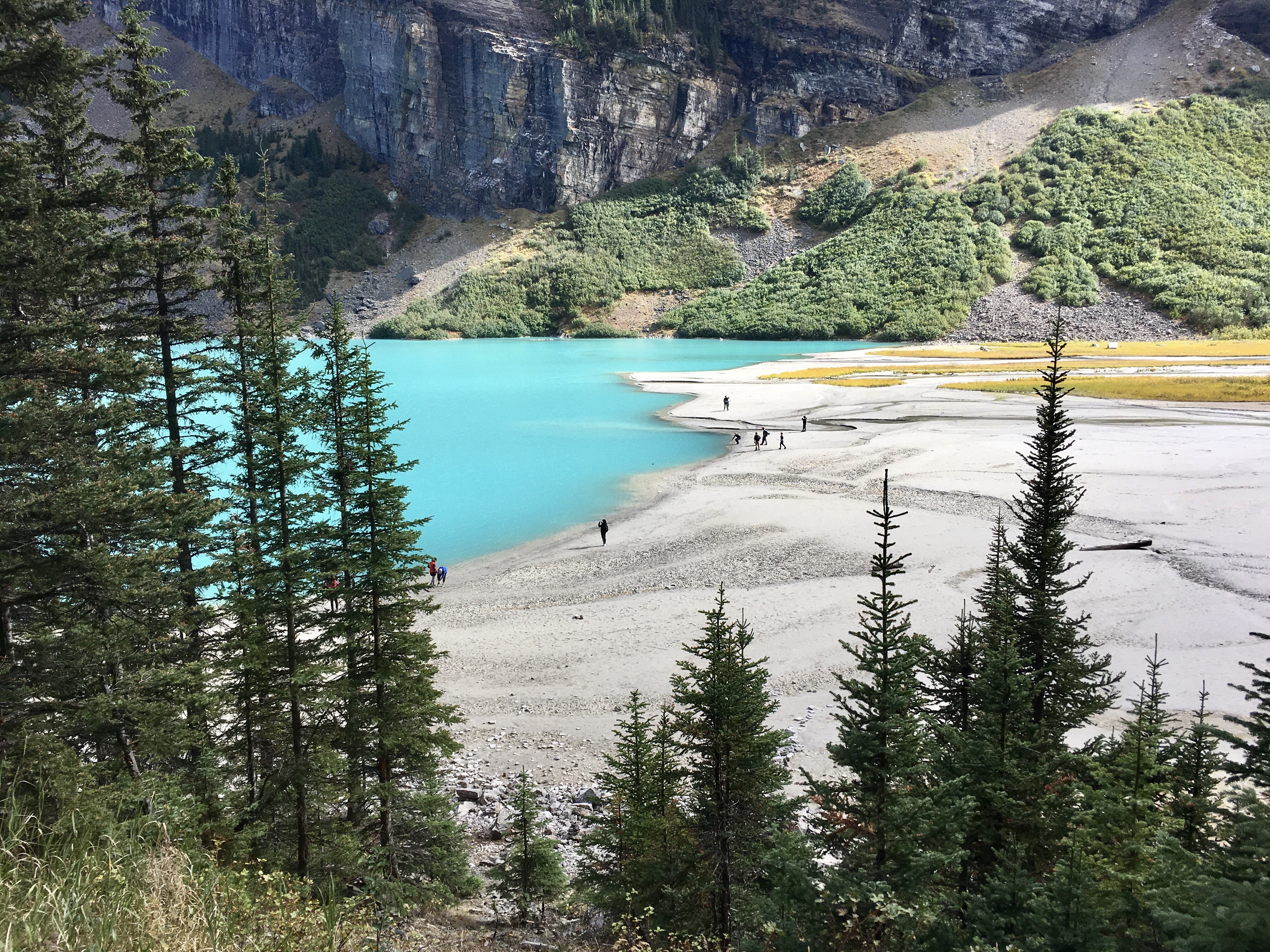 After catching our breath and playing a little heart-stopping slip-and-slide on the loose rock, we descended, taking the Path of the Six Glaciers Trail all the way back down to the Fairmont resort, way off in the distance, 3 miles away.