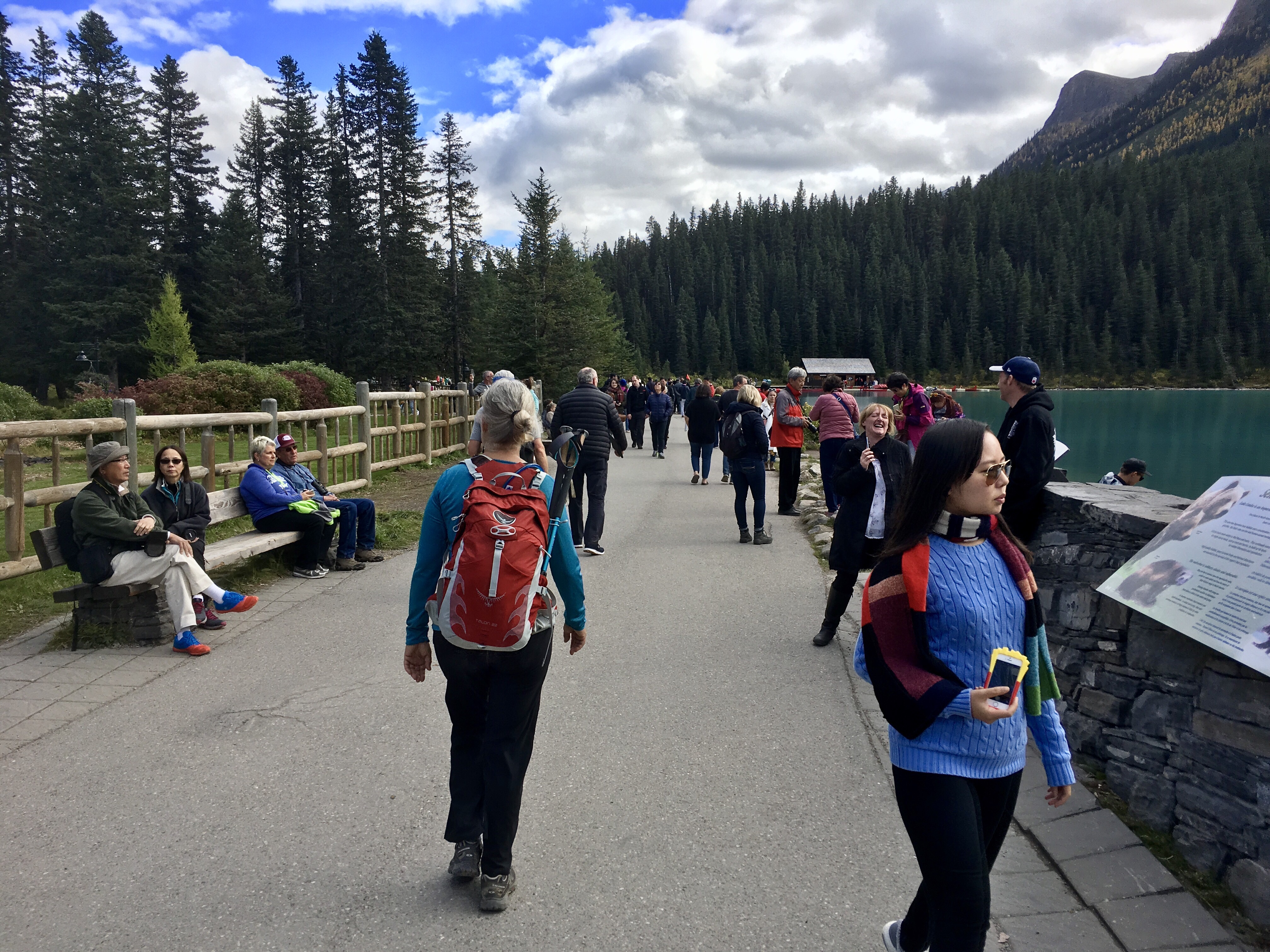 But we had no idea how crowded the place had become while we were out hiking the surrounding trails. But, not with hikers. These people were are all hotel guests and tourists. You can tell because there’s not a single backpack among them (other than Dale’s). It was nice to see so many people enjoying the outdoors, but they were missing the real beauty of Lake Louise by not venturing further out along the trails (fortunately for us).