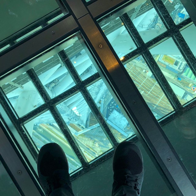 From the Tembo Deck, there’s a second elevator that travels up another 100 meters to the Tembo Gallery observation deck where there is a glass floor. That yellow rectangle to the right is a helipad on the office building, below; to its left is a railroad depot. It’s a looooooooong way down.