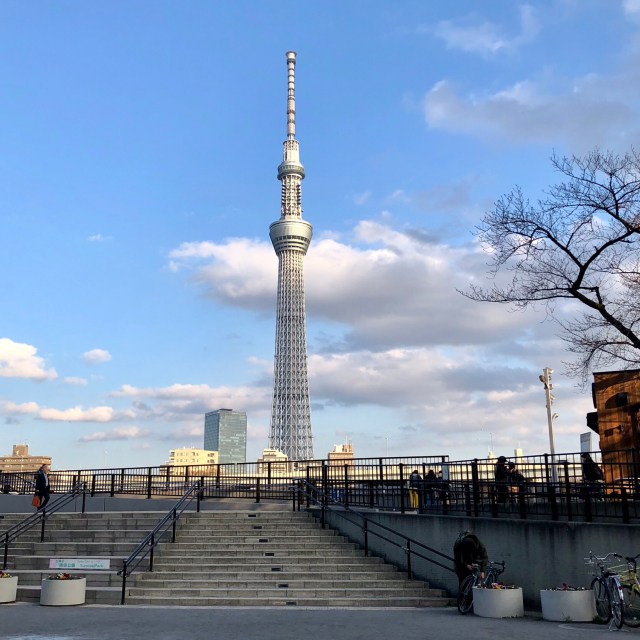 We had a coffee at the snack bar on the observation deck, then descended and walked back toward our hotel. From the other side of the Sumida River, I took the picture, below. That the little building immediately adjacent to the left of the Sky Tree Tower is a 31-story office building.