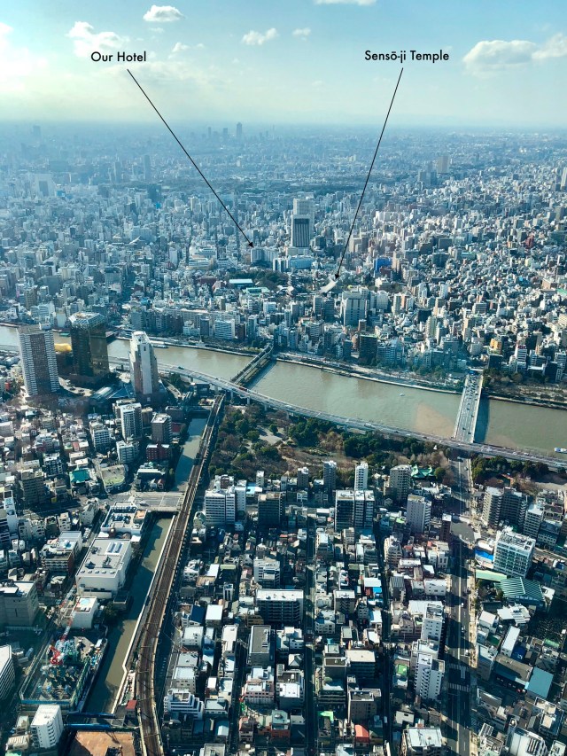 From the station, we followed the crowd into the base of the tower, then I noticed that the brochure mentioned a bypass lane for international travelers (for a reasonable surcharge). We slipped out of line and found the “Fast Skytree Ticket” line and zipped right up to the Tembo Deck, the “lower” observation deck at 350 meters, 1,150 feet! From the Tembo Deck, we looked for our hotel across the Sumida River. We had a hard time finding it at first, but the Sensō-ji Temple stood out and from that landmark we located our hotel: