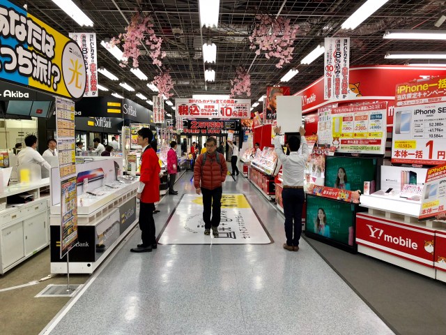 On our way to the Bic Store, however, we passed the Yodobashi Camera Store and thought we’d pop in there first. Turns out that Yodobashi is a step beyond even the Bic Store for electronics, as I learned later on the web where it’s touted as one of the “10 Best Anime and Manga Stores in Tokyo that Will Drive You Crazy!” Well, having visited the place, I’d have to agree. It was sensory overload, started the moment we entered this 7-story electronics and camera bazaar. First, we had to run the gauntlet of smartphone purveyors.