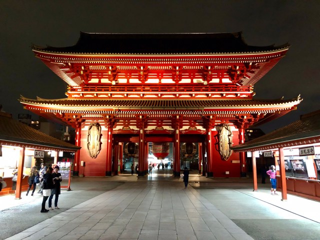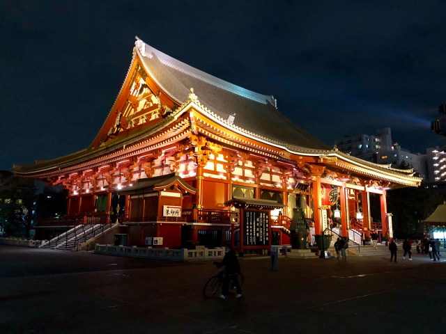 We had a great yakitori dinner at a nearby sidewalk cafe where we met and talked with a couple friendly, young Japanese men, then we walked through the Sensō-ji Temple complex again to see what it looks like at night.