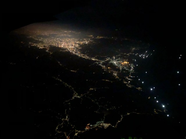It was a cramped, 6-hour flight from Tokyo. Enroute over the East, then South, China Seas, we flew over Taiwan. There were so many ships in the shipping lanes, below (the white lights on the right in the photo, below), it’s easy to see the importance of the area to so many countries.