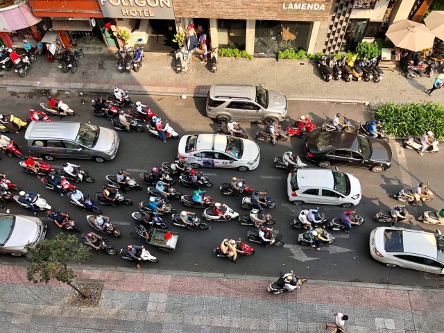 We arrived in Saigon at 10:00pm local time, midnight Tokyo time, checked into our hotel, the Grand Silverland Hotel & Spa, and fell right to sleep. Looking out the front window of the hotel the next morning at breakfast, this was our view, rush-hour in Saigon: